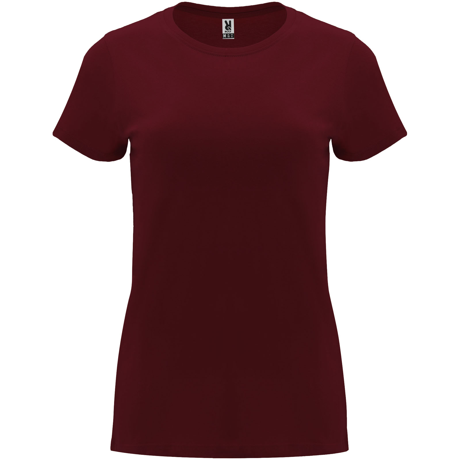 Tailliertes kurzärmeliges T-Shirt für Damen. Rundhalsausschnitt mit 1×1 Rippstrick. Verstärkte und verdeckte Nähte am Kragen. Herausnehmbares Etikett.