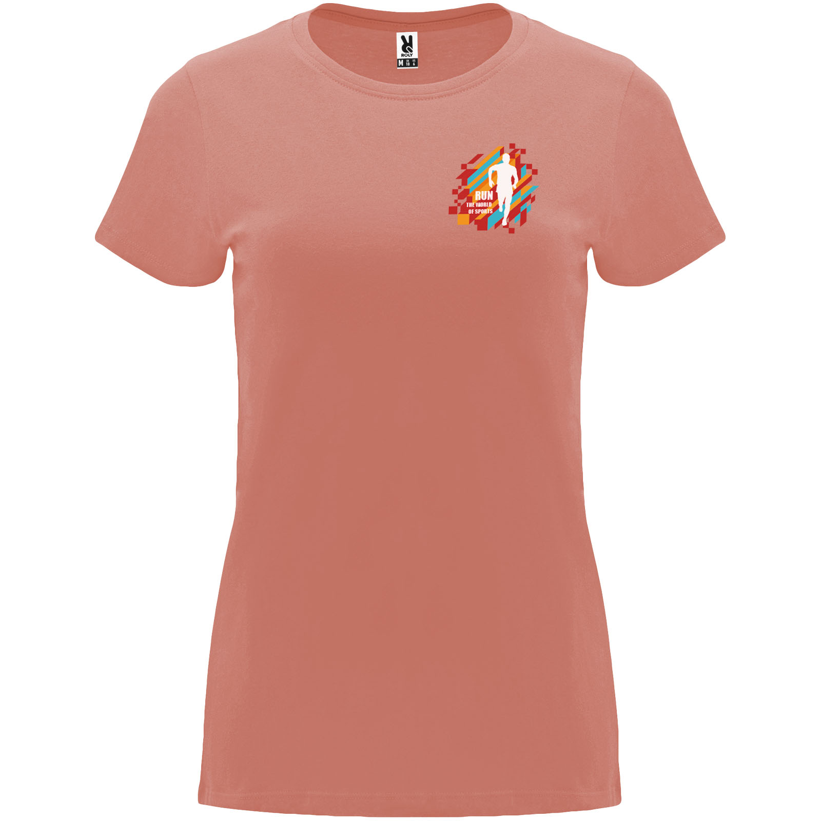 Tailliertes kurzärmeliges T-Shirt für Damen. Rundhalsausschnitt mit 1×1 Rippstrick. Verstärkte und verdeckte Nähte am Kragen. Herausnehmbares Etikett.