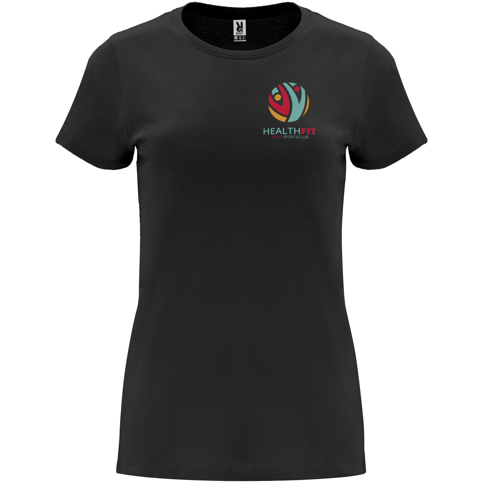 Tailliertes kurzärmeliges T-Shirt für Damen. Rundhalsausschnitt mit 1×1 Rippstrick. Verstärkte und verdeckte Nähte am Kragen. Herausnehmbares Etikett.