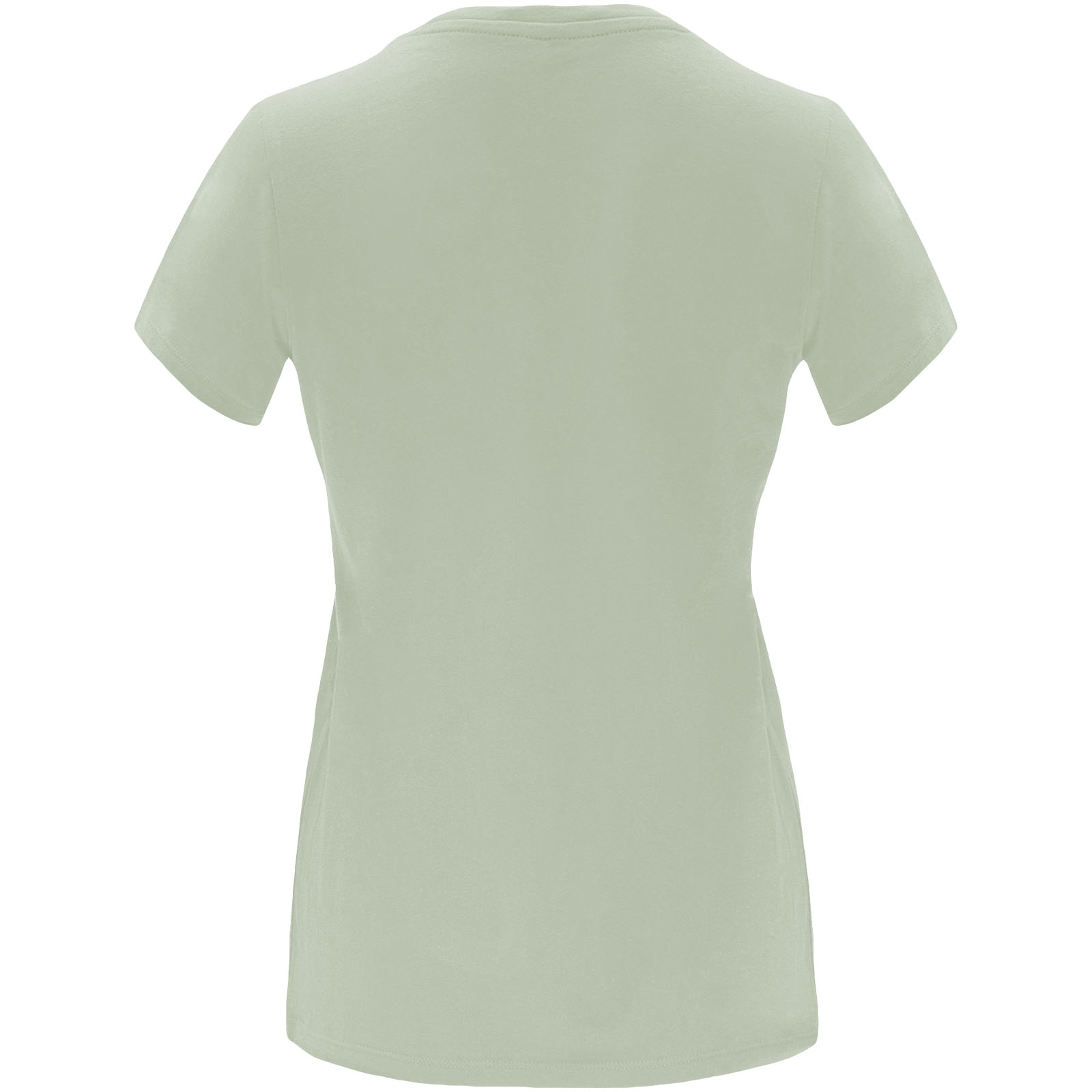 Tailliertes kurzärmeliges T-Shirt für Damen. Rundhalsausschnitt mit 1×1 Rippstrick. Verstärkte und verdeckte Nähte am Kragen. Herausnehmbares Etikett.