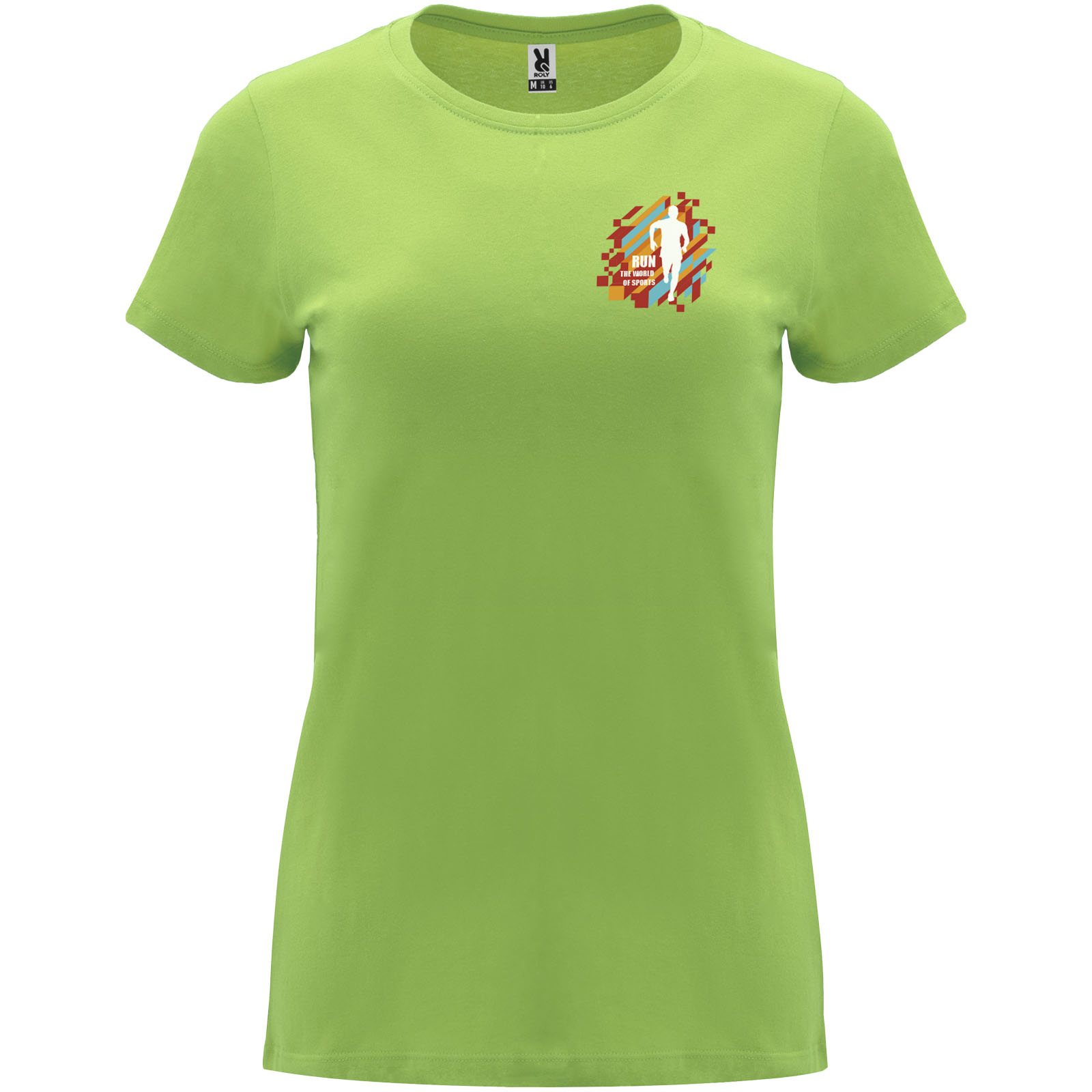 Tailliertes kurzärmeliges T-Shirt für Damen. Rundhalsausschnitt mit 1×1 Rippstrick. Verstärkte und verdeckte Nähte am Kragen. Herausnehmbares Etikett.