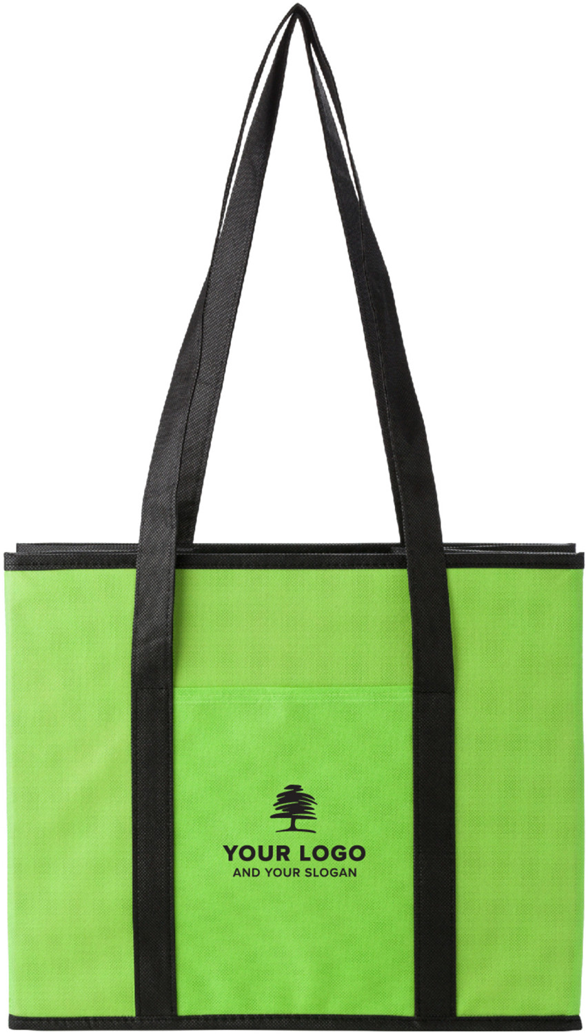 Car-Organizer aus Non-Woven, faltbar, mit Fronttasche, 2 langen und 2 kurzen Tragegriffen und Kartonboden.
