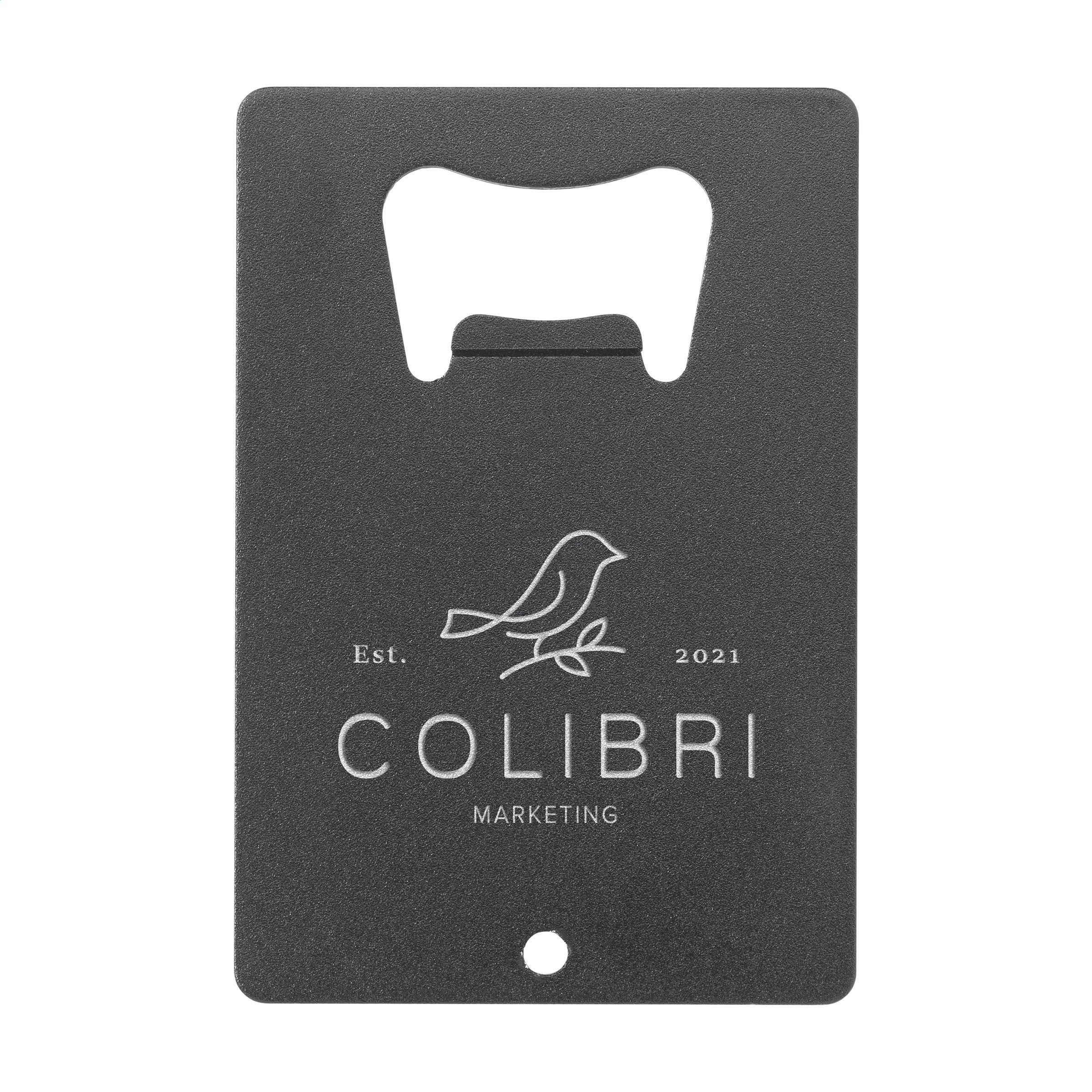 Flaschenöffner aus 100% recyceltem Aluminium. Der Öffner in praktischem Kreditkartenformat lässt sich mühelos an einem Schlüsselring befestigen. GRS-zertifiziert.Durch die Verwendung von recyceltem Aluminium werden bei der Herstellung dieses Produkts weniger neue Rohstoffe verwendet. Das bedeutet weniger Energieverbrauch und weniger Wasserverbrauch.