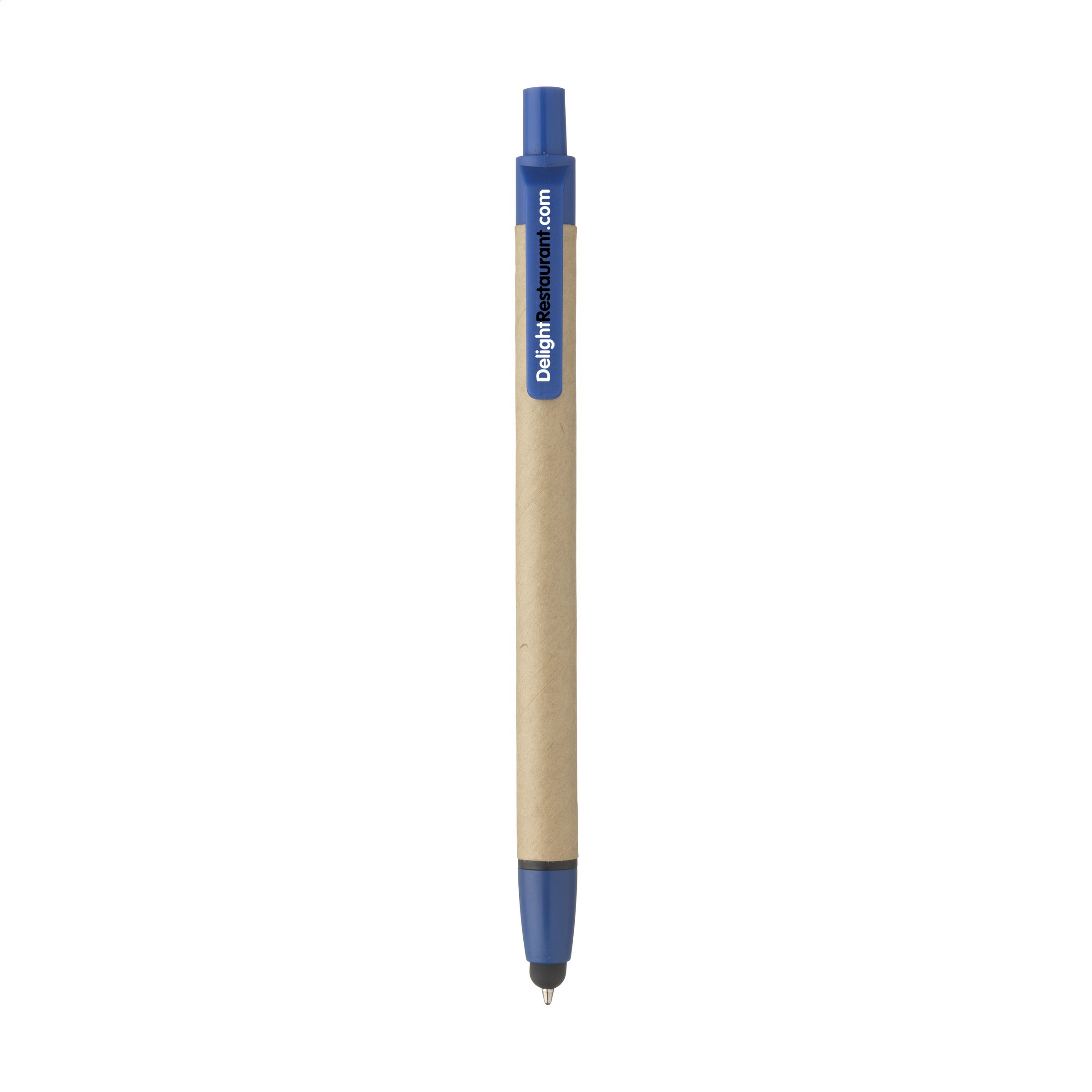Beschreibung: WoW! Blauschreibender Kugelschreiber mit Recyclingkartongehäuse, gummierter Spitze zum Bedienen von Touchscreens und Kunststoffakzenten.