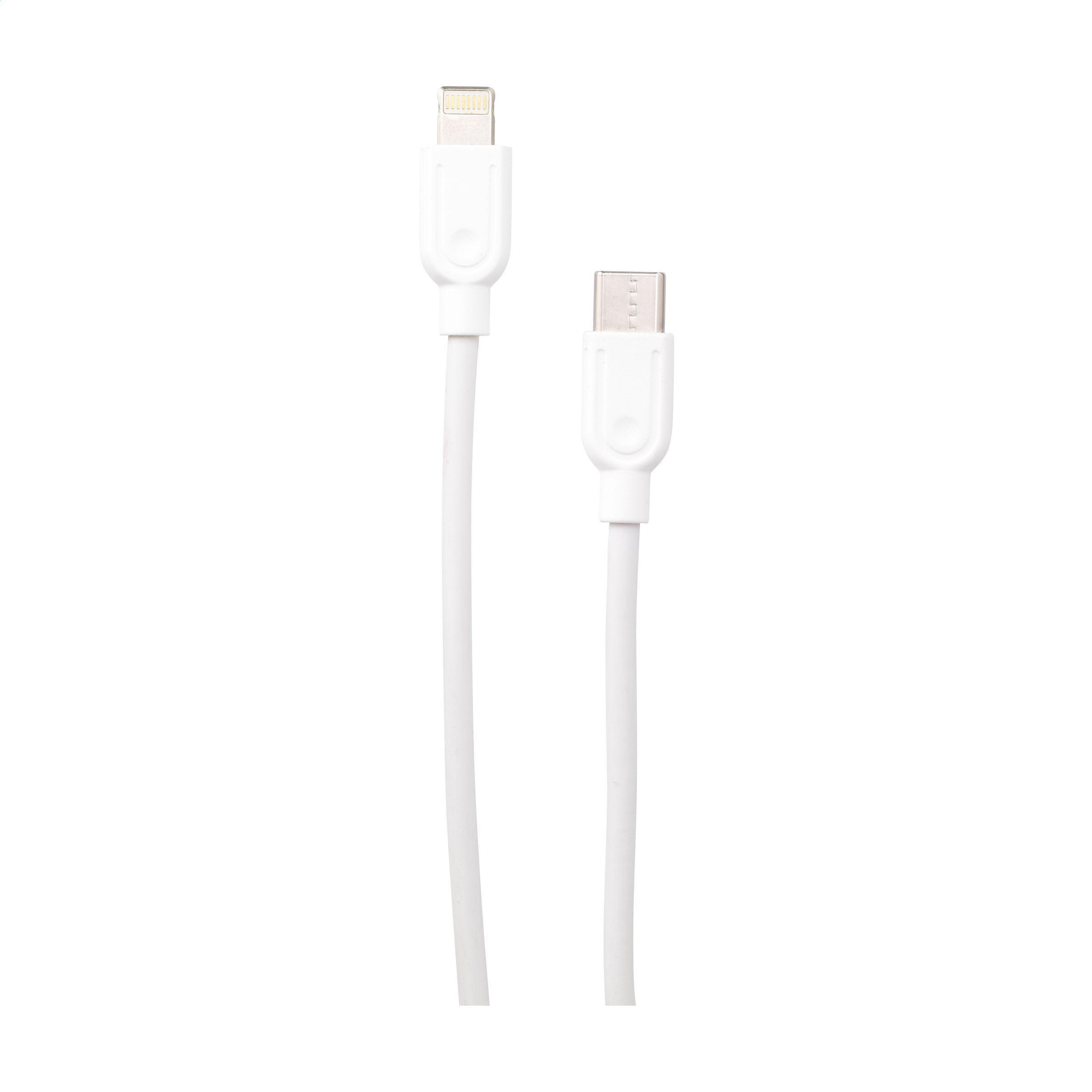 Ladekabel (10W) aus recyceltem ABS und recyceltem TPE. Eingang: Typ-C- und USB-A-Verbinder. Ausgang: Typ-C und Lightning. RCS-zertifiziert. Recyceltes Material insgesamt: 47%. Kabellänge: 120 cm.