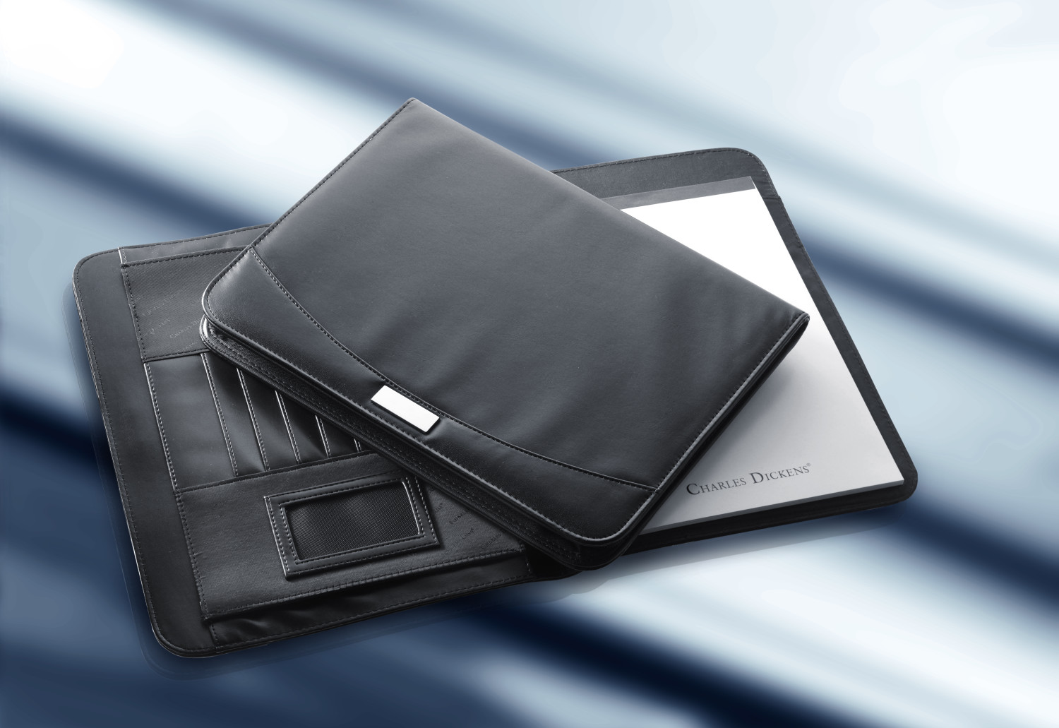 Charles Dickens Dokumentenmappe aus Kunstleder, ca. DIN A4-Format, mit 6 Einsteckfächern, Schreibblock, Taschenrechner und Metallplätchen für Gravuren, verpackt in einer Non-Woven Tasche und Geschenkbox (Lieferung ohne Stift).