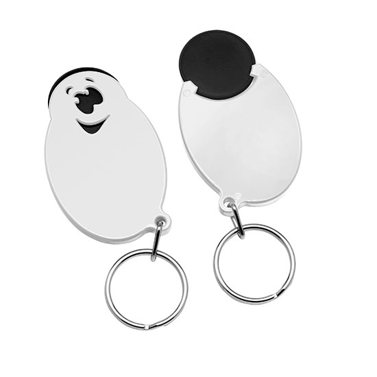 Chiphalter mit 1€-Chip "Gesicht" mit Schlüsselring. Farbkombinationen möglich. Druckkosten pro Position