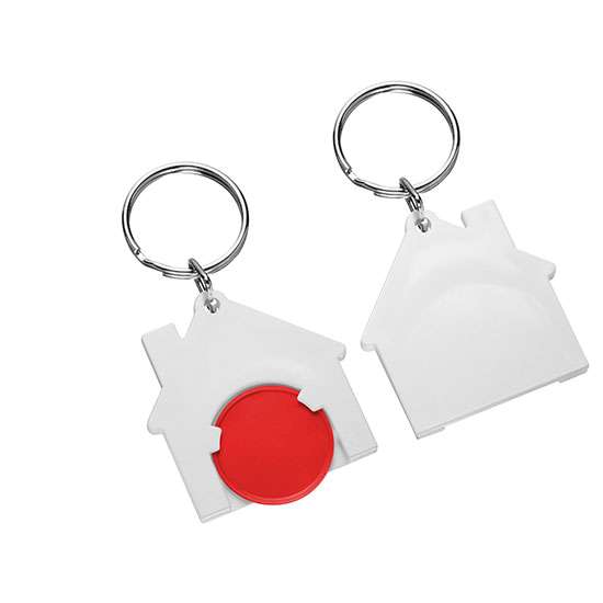 Chiphalter mit 1€-Chip "Haus" mit Schlüsselring. Farbkombinationen möglich. Druckkosten pro Position