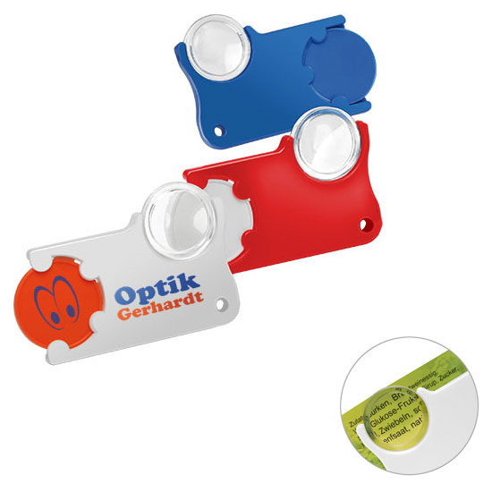 Chiphalter mit 1€-Chip und Lupe ohne Gliederkette, ohne Schlüsselring. Farbkombinationen möglich. Druckkosten pro Position