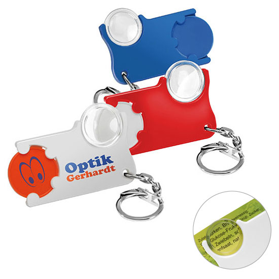 Chiphalter mit 1€-Chip und Lupe mit Gliederkette. Farbkombinationen möglich. Druckkosten pro Position