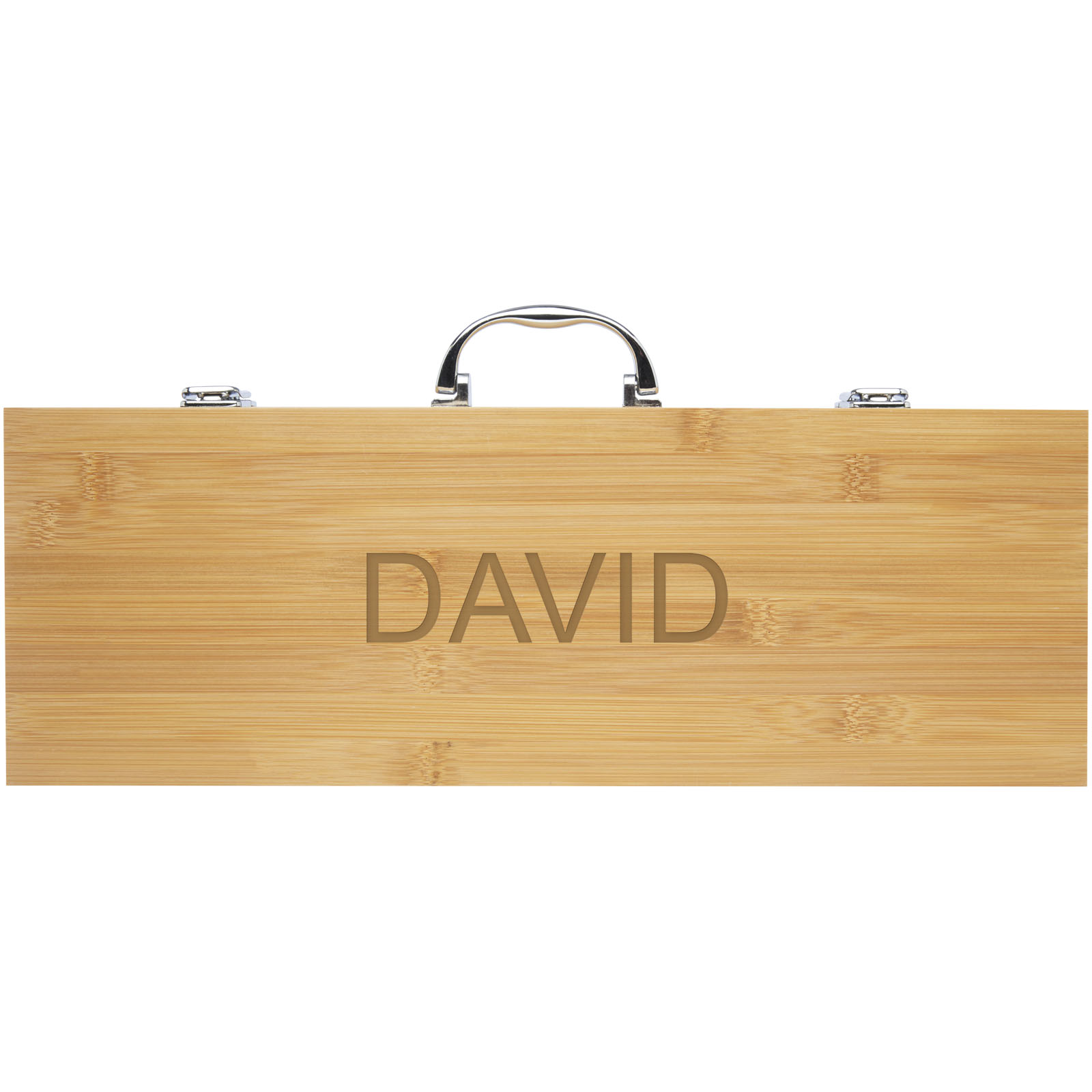 5-teiliges BBQ-Set aus Bambus mit Wender (40 x 9,5 cm), Zange (34,5 x 6 cm), Gabel (38,5 x 3 cm), Messer (38,5 x 3 cm) und Pinsel (38 x 4,3 cm). Das Set wird in einer Geschenkbox aus Bambus (46 x 16,2 x 7,4 cm) geliefert. Die Griffe und die Geschenkbox sind aus Bambus gefertigt, der nach nachhaltigen Normen beschafft und produziert wird.