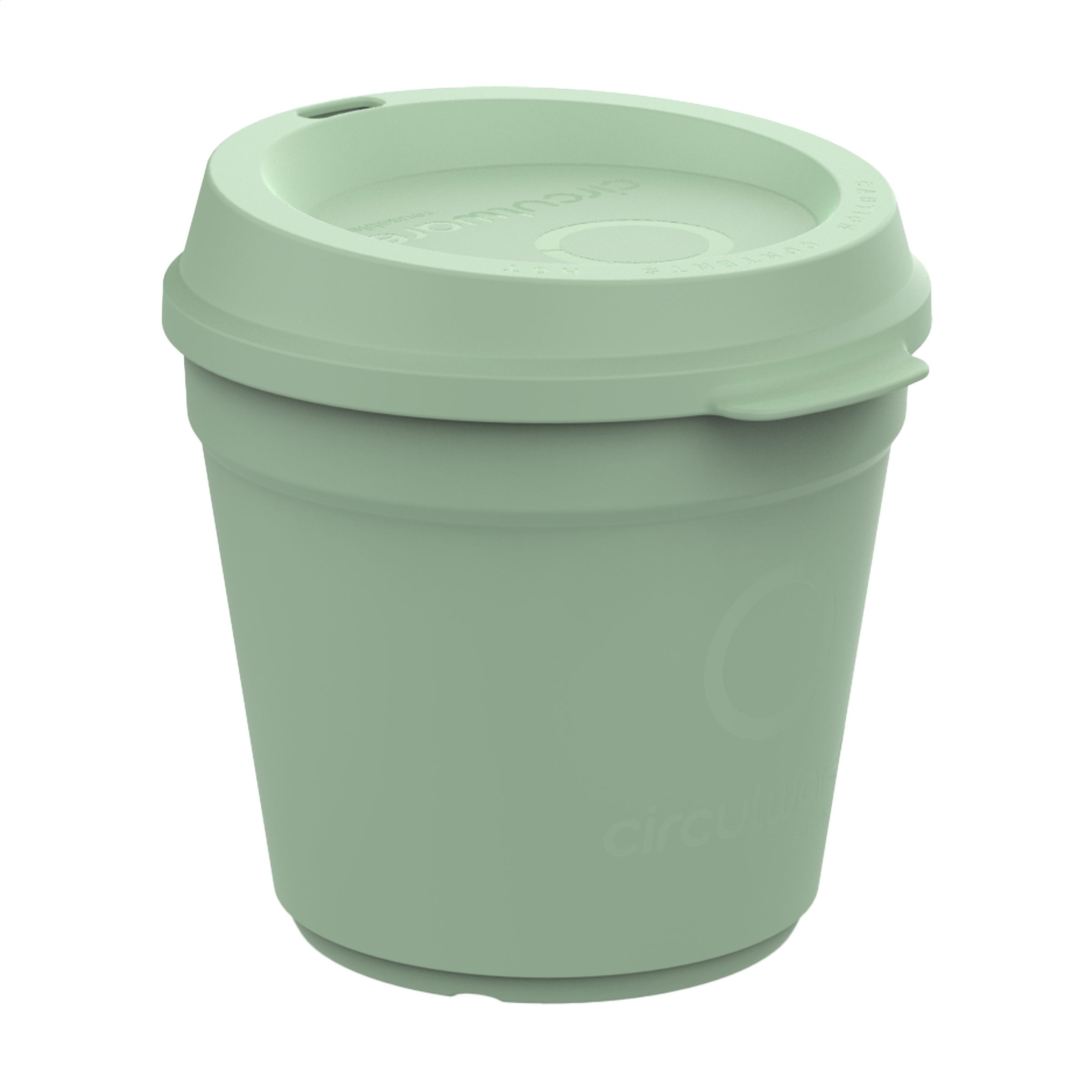 Wiederverwendbarer, stapelbarer Becher mit Deckel der Marke Circulware. Dieser Becher ist aus hochwertigem Kunststoff hergestellt und kann bis zu 500 Mal verwendet werden. Der stapelbare Deckel besteht zu 100% aus recycelbarem Kunststoff und schließt perfekt. Dies macht ihn zu einem idealen Becher für unterwegs. Geeignet für einen heißen Kaffee oder ein erfrischendes Getränk. Eine großartige Alternative zum Einwegbecher. Der Becher ist leicht, einfach zu reinigen und stapelbar, also platzsparend. BPA-frei und für Lebensmittel zugelassen. Spülmaschinengeeignet und mikrowellengeeignet. 100% recycelbar. Damit leistet dieser Becher einen Beitrag zur Kreislaufwirtschaft. Niederländisches Design. Made in Holland. Fassungsvermögen: 200 ml.