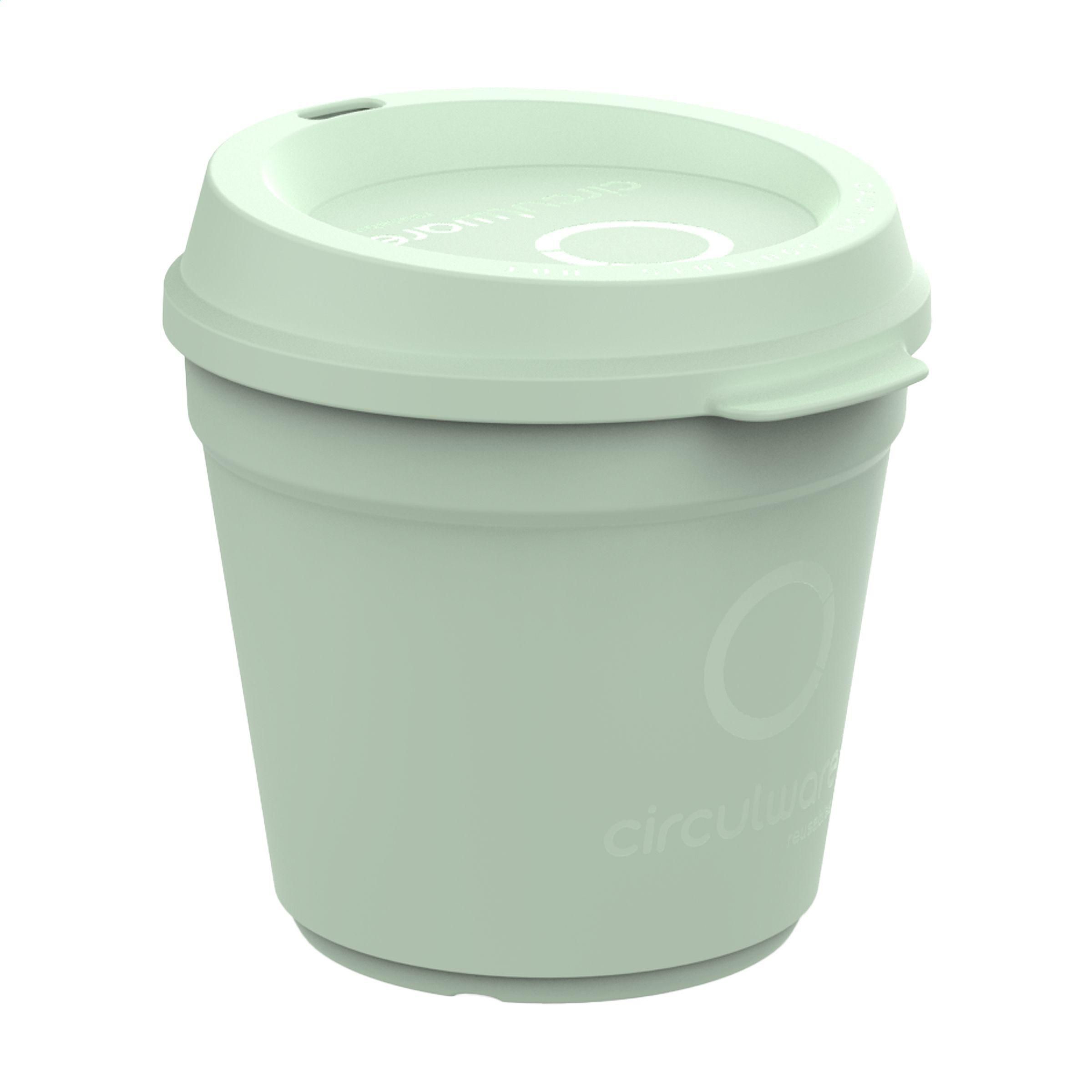 iederverwendbarer, stapelbarer Becher mit Deckel der Marke Circulware. Dieser Becher ist aus hochwertigem Kunststoff hergestellt und kann bis zu 500 Mal verwendet werden. Der stapelbare Deckel besteht zu 100% aus recycelbarem Kunststoff und schließt perfekt. Dies macht ihn zu einem idealen Becher für unterwegs. Geeignet für einen heißen Kaffee oder ein erfrischendes Getränk. Eine großartige Alternative zum Einwegbecher. Der Becher ist leicht, einfach zu reinigen und stapelbar, also platzsparend. Für Lebensmittel zugelassen. Spülmaschinengeeignet und mikrowellengeeignet. 100% recycelbar. Damit leistet dieser Becher einen Beitrag zur Kreislaufwirtschaft. Niederländisches Design. Made in Holland. Fassungsvermögen: 200 ml.