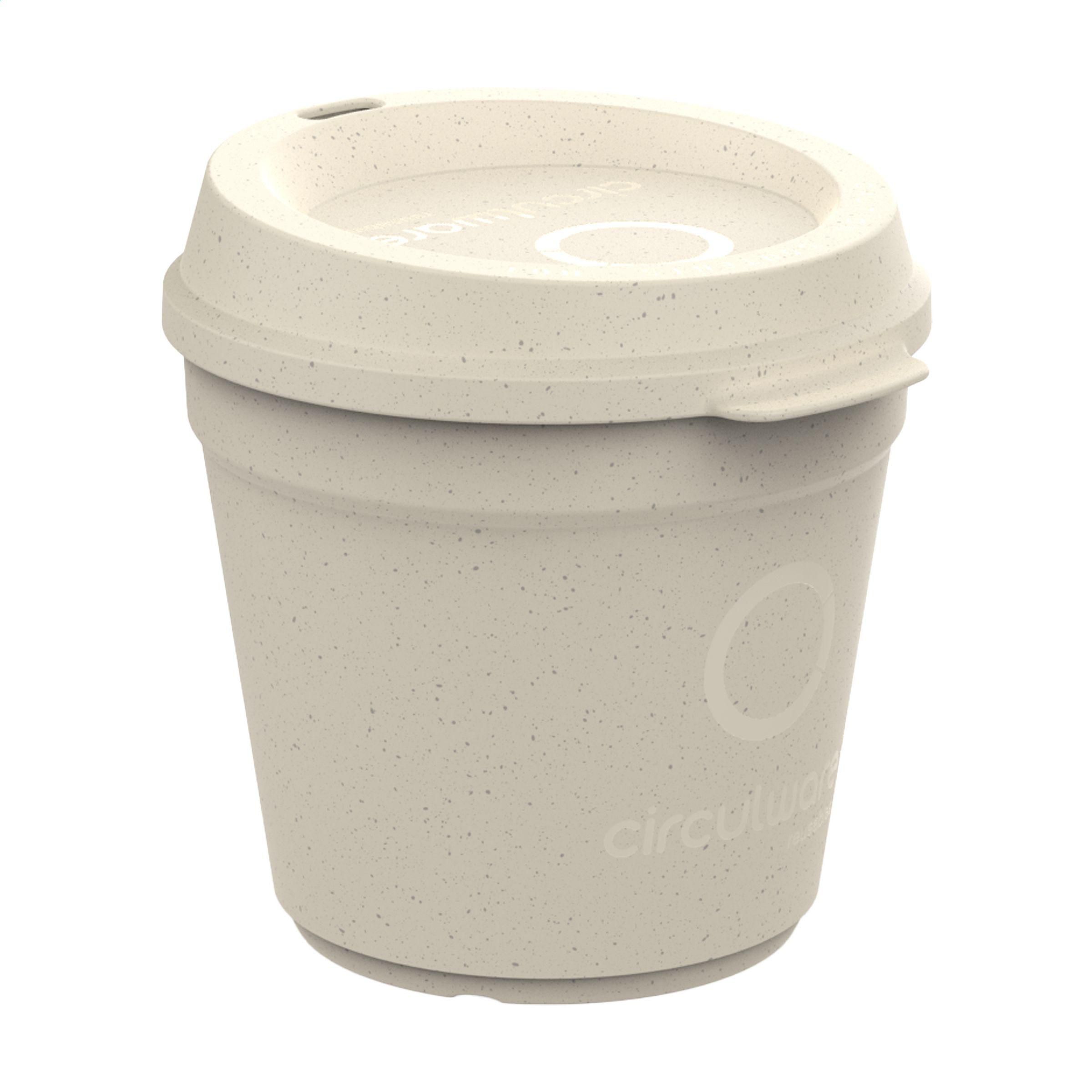iederverwendbarer, stapelbarer Becher mit Deckel der Marke Circulware. Dieser Becher ist aus hochwertigem Kunststoff hergestellt und kann bis zu 500 Mal verwendet werden. Der stapelbare Deckel besteht zu 100% aus recycelbarem Kunststoff und schließt perfekt. Dies macht ihn zu einem idealen Becher für unterwegs. Geeignet für einen heißen Kaffee oder ein erfrischendes Getränk. Eine großartige Alternative zum Einwegbecher. Der Becher ist leicht, einfach zu reinigen und stapelbar, also platzsparend. Für Lebensmittel zugelassen. Spülmaschinengeeignet und mikrowellengeeignet. 100% recycelbar. Damit leistet dieser Becher einen Beitrag zur Kreislaufwirtschaft. Niederländisches Design. Made in Holland. Fassungsvermögen: 200 ml.