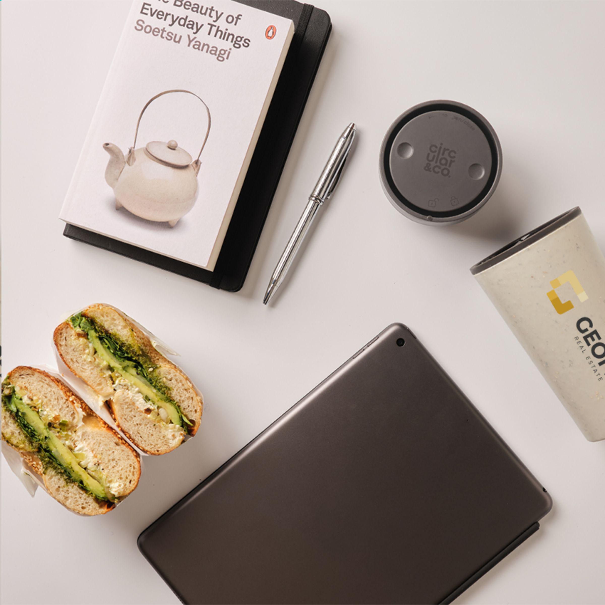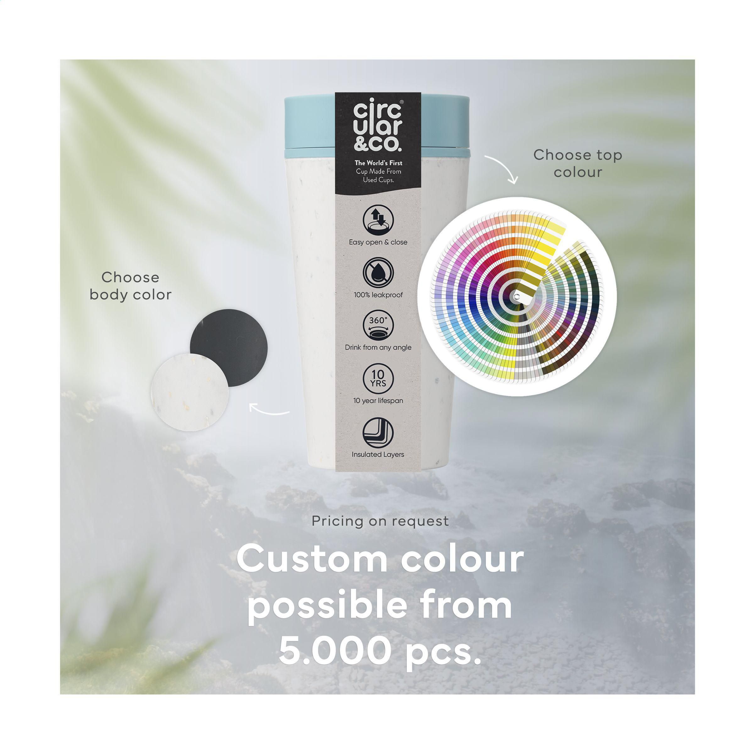 Doppelwandiger, wiederverwendbarer Kaffeebecher-to-go mit Deckel von Circular&Co. Die äußere Isolierschicht dieses Bechers wird aus gebrauchten, recycelten Einweg-Kaffeebechern aus Papier hergestellt. Mit Innenwand und Deckel aus PP. 100% auslaufsicher. Die isolierende Wirkung hält Ihr Heißgetränk länger heiß und Ihr Kaltgetränk länger kalt. Der Deckel ist mit der patentierten 360-Grad-Technologie ausgestattet, die es Ihnen ermöglicht, aus jedem Winkel zu nippen. Der Kaffeebecher lässt sich mit einer Hand und einem Klick öffnen und schließen. Ideal für unterwegs. 100% recycelbar. Spülmaschinengeeignet. Um den Aufdruck zu erhalten, wird Waschen von Hand empfohlen. Fassungsvermögen: 340 ml. EXTRA INFO: Bei einer Mindestbestellmenge von 5.000 Stück ist der Deckel dieses Produkts in jeder PMS-Farbe erhältlich. Auf diese Weise schaffen Sie eine perfekte Übereinstimmung zwischen Produkt und Aufdruck.