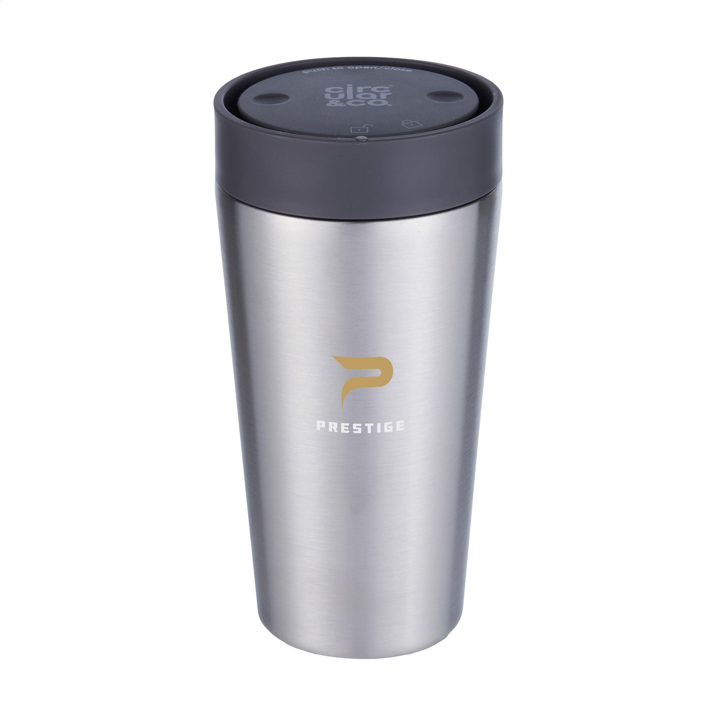 Doppelwandiger, wiederverwendbarer Kaffee-to-go-Thermosbecher mit Deckel von Circular&Co. Der Becher besteht zu 98% aus recyceltem Edelstahl. Der Deckel besteht aus PP und ist zu 100% recycelbar. Durch die isolierende Wirkung bleiben Getränke bis zu 6 Stunden warm oder bis zu 12 Stunden kalt. Der Deckel dieser Kaffeebecher verfügt über besondere innovative Funktionen wie einen trust-lock™-Mechanismus und einen swift-click™-Verschluss. Zum Trinken den Deckel drücken. Klicken Sie auf den Deckel, um den Becher zu schließen und drehe um den Deckel zu verriegeln. Das geht ganz einfach mit einer Hand. Darüber hinaus verfügt der Deckel über eine klare Öffnungs- und Schließposition für ein noch besseres 360-Grad-Trinkerlebnis, sodass Sie aus jedem Winkel trinken können. Dieser ideale Becher ist daher 100% auslauf- und kleckerfrei und ideal für unterwegs. Spülmaschinengeeignet. Um den Aufdruck zu erhalten, wird Waschen von Hand empfohlen. Inklusive Gebrauchsanweisung. Fassungsvermögen: 340 ml.