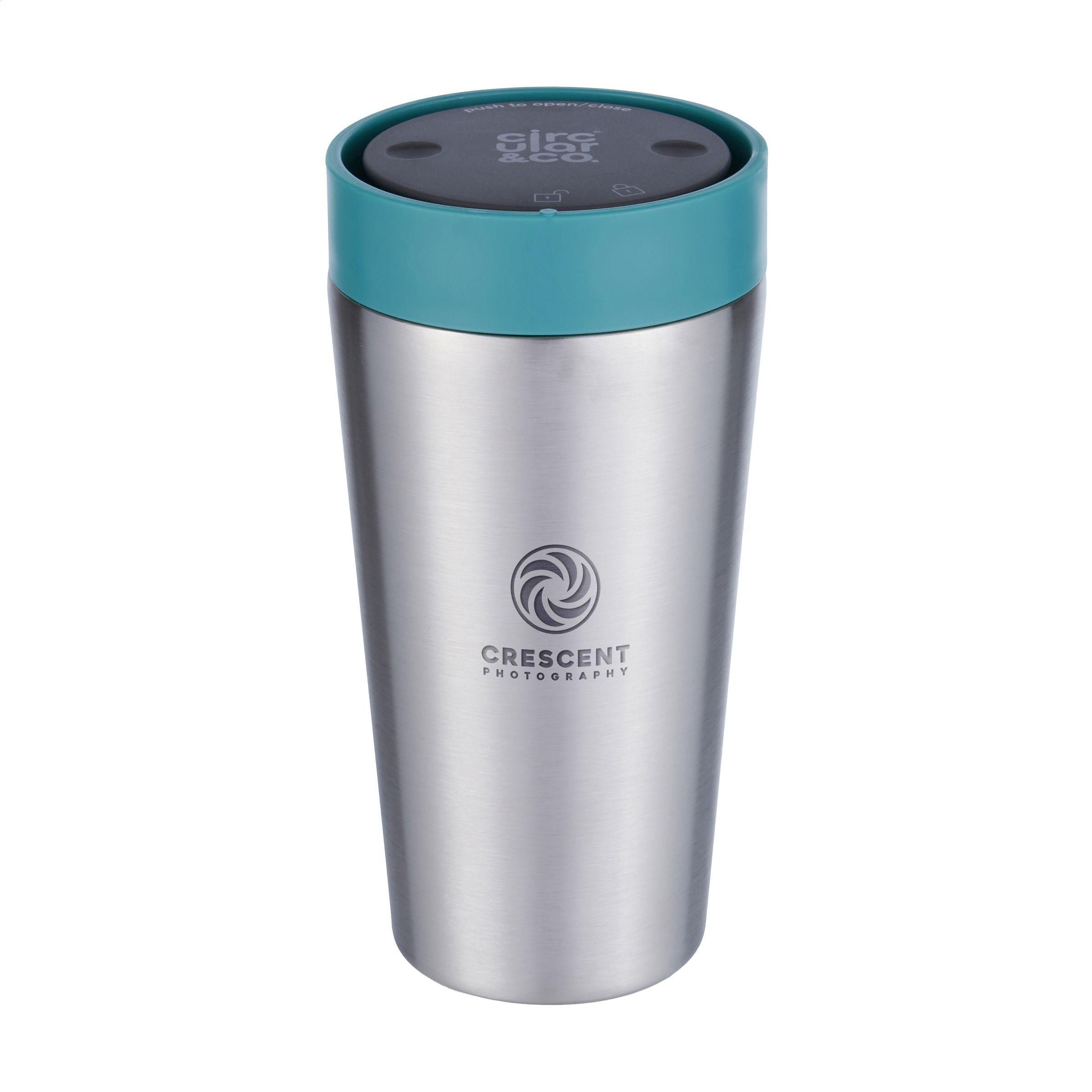Doppelwandiger, wiederverwendbarer Kaffee-to-go-Thermosbecher mit Deckel von Circular&Co. Der Becher besteht zu 98% aus recyceltem Edelstahl. Der Deckel besteht aus PP und ist zu 100% recycelbar. Durch die isolierende Wirkung bleiben Getränke bis zu 6 Stunden warm oder bis zu 12 Stunden kalt. Der Deckel dieser Kaffeebecher verfügt über besondere innovative Funktionen wie einen trust-lock™-Mechanismus und einen swift-click™-Verschluss. Zum Trinken den Deckel drücken. Klicken Sie auf den Deckel, um den Becher zu schließen und drehe um den Deckel zu verriegeln. Das geht ganz einfach mit einer Hand. Darüber hinaus verfügt der Deckel über eine klare Öffnungs- und Schließposition für ein noch besseres 360-Grad-Trinkerlebnis, sodass Sie aus jedem Winkel trinken können. Dieser ideale Becher ist daher 100% auslauf- und kleckerfrei und ideal für unterwegs. Spülmaschinengeeignet. Um den Aufdruck zu erhalten, wird Waschen von Hand empfohlen. Inklusive Gebrauchsanweisung. Fassungsvermögen: 340 ml.
