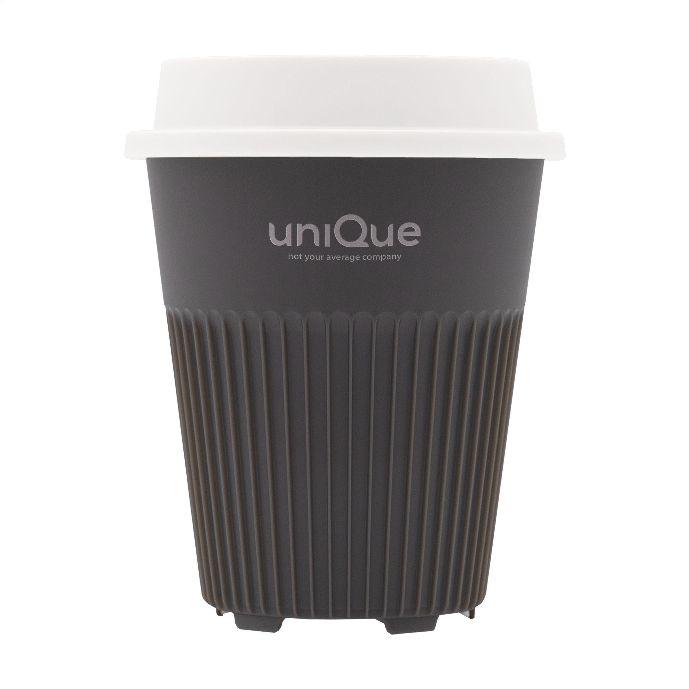 iederverwendbarer Kaffee-to-go-Becher mit Deckel von Circular&Co. Hergestellt aus 100% recyclebarem, robustem PP. Dieser stapelbare Becher sieht nicht nur attraktiv aus, das Design legt auch den Fokus auf Funktionalität. Die Rippen leiten die Wärme des Getränks ab und bieten einen angenehmen Griff. Außerdem hat der Becher einen schnell trocknenden Boden. Der Deckel mit Trinköffnung verhindert das Verschütten von Getränken. Passt in den Standard-Getränkehalter von Autos, also perfekt für unterwegs, aber auch als Becher an der Kaffeemaschine. Die perfekte Alternative zum Einweg-Kaffeebecher. Dieser Becher hält mehr als 500 Waschgänge und ist bis zu 6 Mal recycelbar. Nach nur 2 Benutzungen sind die CO2-Emissionen des Coffee-to-go-Bechers im Vergleich zu einer Einweg-Alternative ausgeglichen. Das bedeutet, dass große Mengen an CO2 nicht in die Atmosphäre gelangen. Durch den Wechsel zu einem wiederverwendbaren Becher landen Milliarden von Bechern weniger auf der Mülldeponie. Nur für die Spülmaschine im oberen Geschirrkorb geeignet. Fassungsvermögen 340 ml.