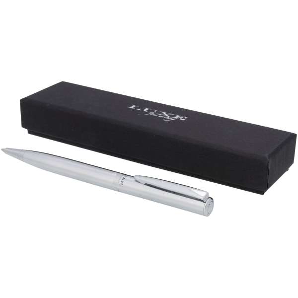 Der leichte Kugelschreiber kommt mit einem exklusiven Design, erhältlich in einer matt-gebürsteten Gold-Ausführung mit goldfarbenen Akzenten und matt-gebürstetem Silber mit chromfarbenen Akzenten. Inklusive einer hochwertigen schwarzen Ersatzmine und verpackt in einer "LUXE"-Geschenkschachtel (16,5 x 4,5 x 2,8 cm).