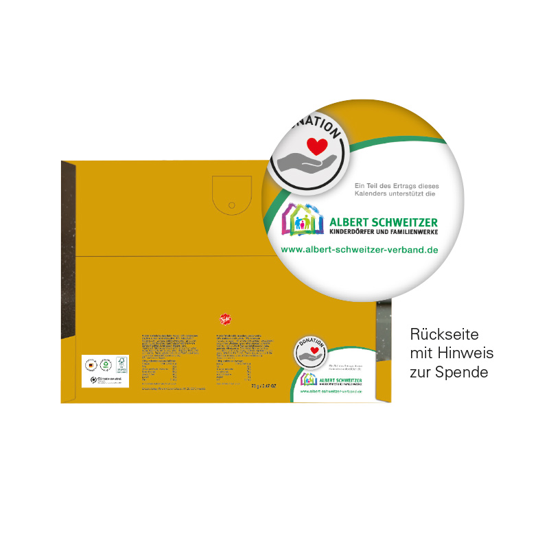 Wand Adventskalender in Kartonhülle aus Graspapier, in Querformat, recycelbar, individuell bedruckt. Ein Teil des Ertrags dieses Kalenders unterstützt die Albert Schweitzer Kinderdörfer und Familienwerke. Inhalt: 24 Friedel Vollmilch Schokoladentäfelchen. Saisonartikel - solange der Vorrat reicht!