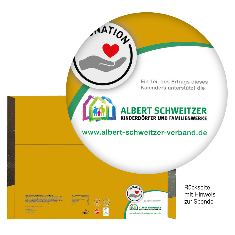 Rätsel Adventskalender in Kartonhülle aus Graspapier, Hochformat recycelbar, mit Rätselmotiv "Weihnachtsdinner". Im unteren Teil des Kalenders ist Platz (Ca.245 x 40 mm) für dein Logo und deinen individuellen Weihnachtsgruß. Ein Teil des Ertrags dieses Kalenders unterstützt die Albert Schweitzer Kinderdörfer und Familienwerke. Inhalt: 24 Friedel Vollmilch Schokoladentäfelchen, 70 g
