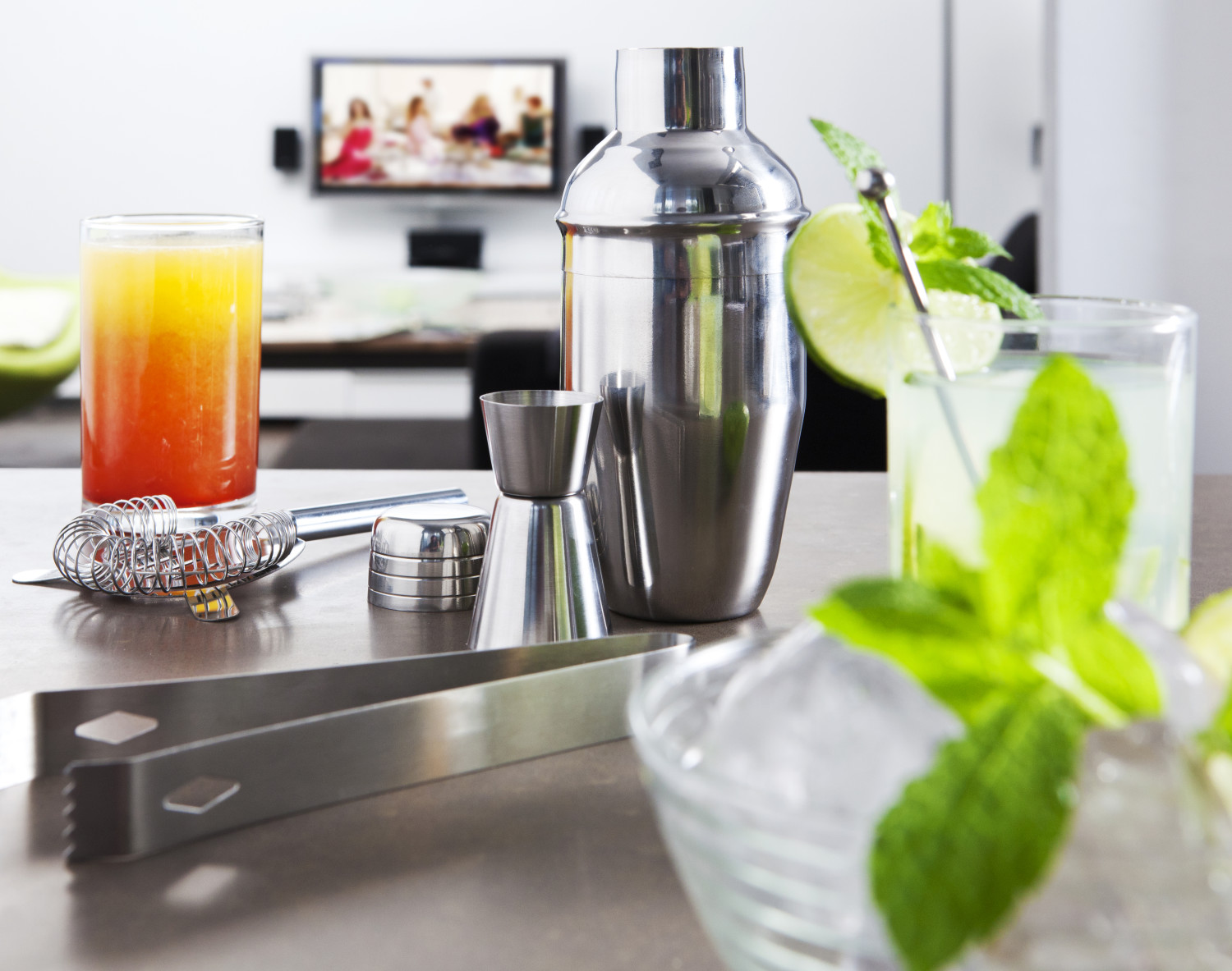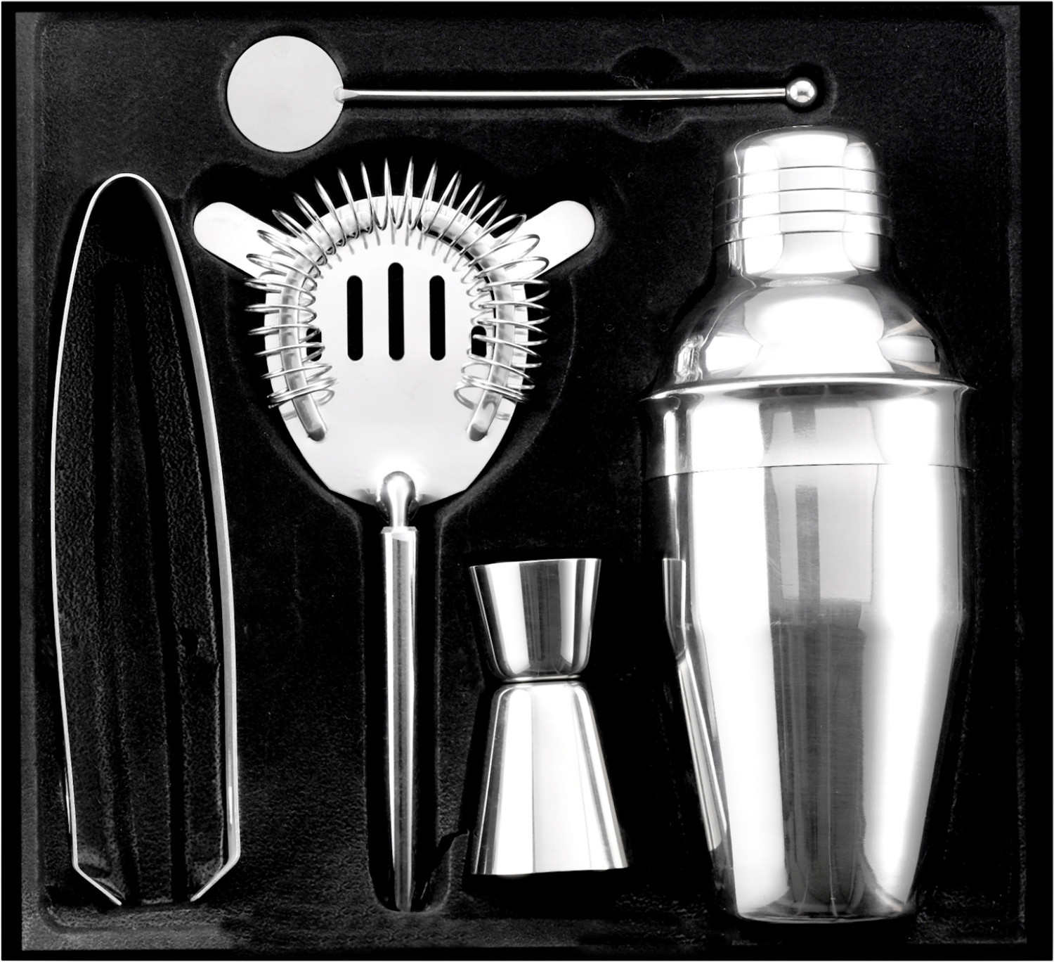 Cocktailshaker-Set aus Edelstahl, 5-tlg., bestehend aus Shaker (ca. 350 ml), Löffel, Zange, Sieb und Messbecher.
