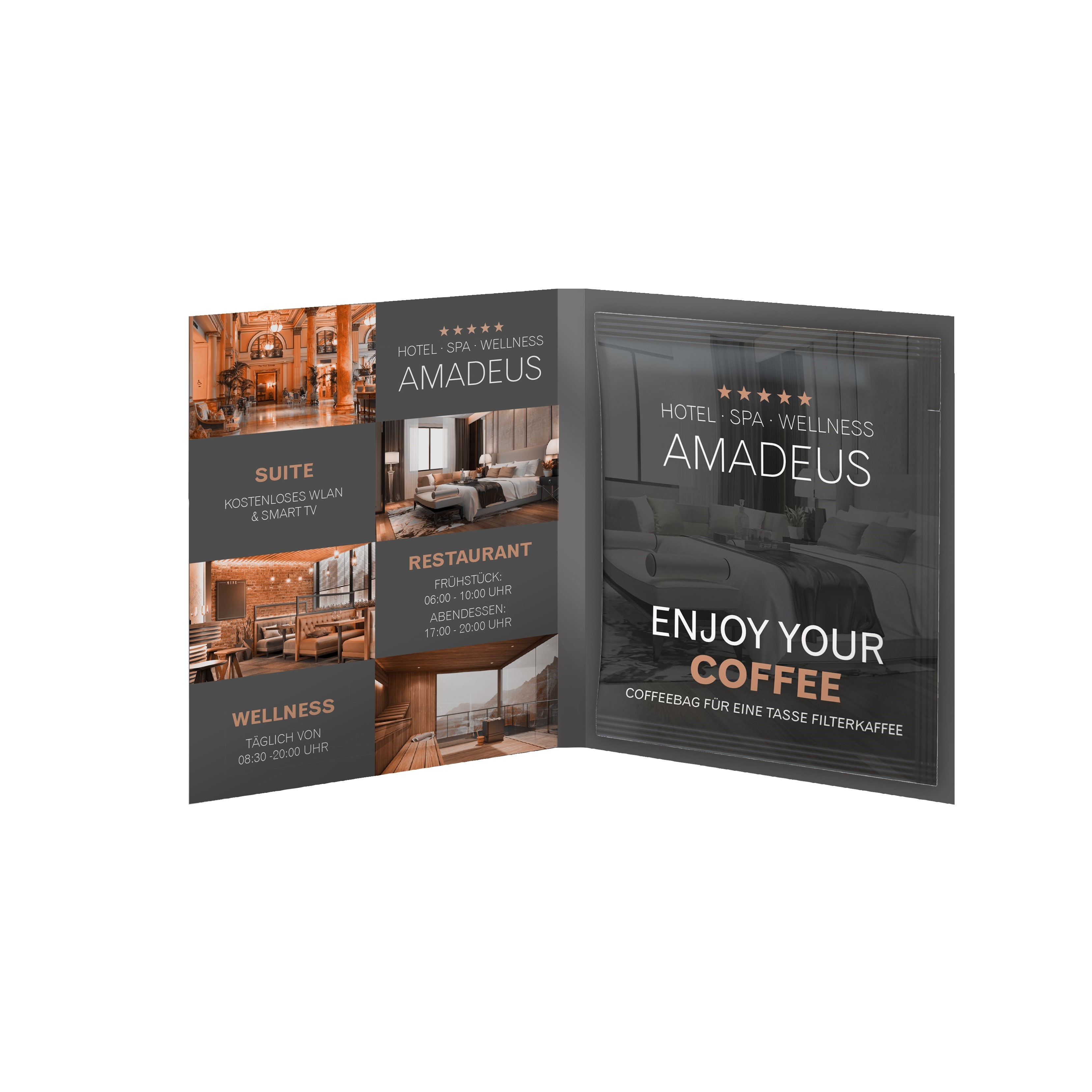 CoffeeFlyer (Klappkarte) mit eingeklebtem CoffeeBag. Seidenmatter Karton aus kontrolliert ökologischer und nachhaltig bewirtschafteter Forstwirtschaft. Enthält 1 CoffeeBag - die natürliche Alternative zu Kapseln. Kaffee-Filter mit 10 g gemahlenem Kaffee für 1 Tasse Filterkaffee, verpackt in bedruckter Aromaverpackung. Der CoffeeBag besteht aus nachwachsenden Rohstoffen und ist kompostierbar. So einfach gehts: Filter öffnen, auf die Tasse setzen, mit heißem Wasser übergießen - fertig. Kaffeesorte: Bio Direct Trade • Bio Arabica-Kaffee aus Direkthandel mit transparenter Lieferkette • Schonende Trommelröstung in Deutschland • Regional abgefüllt in einem sozialtherapeutischem Betrieb • Würzig-weiches, vollmundiges Aroma mit milder Säure Dieser direkt gehandelte Bio Kaffee aus Peru vereint höchste Qualität mit sozialen Werten. Der außergewöhnliche Kaffee stammt von einer kleinen Anbaugemeinschaft, die seit 2011 hochwertige Arabica-Bohnen kultiviert. Diese werden direkt und ohne weitere Zwischenhändler nach Deutschland importiert, was eine transparente Lieferkette vom Anbau bis zur Röstung gewährleistet. In Deutschland wird der Kaffee schonend geröstet und regional in einem sozialtherapeutischen Betrieb frisch abgefüllt: das garantiert ein außergewöhnliches Aroma und höchste soziale Verantwortung. DE-ÖKO-003 / Nicht-EU Landwirtschaft Druck: 4-farbiger Digitaldruck (CMYK) auf die Aromaverpackung und die Klappkarte.