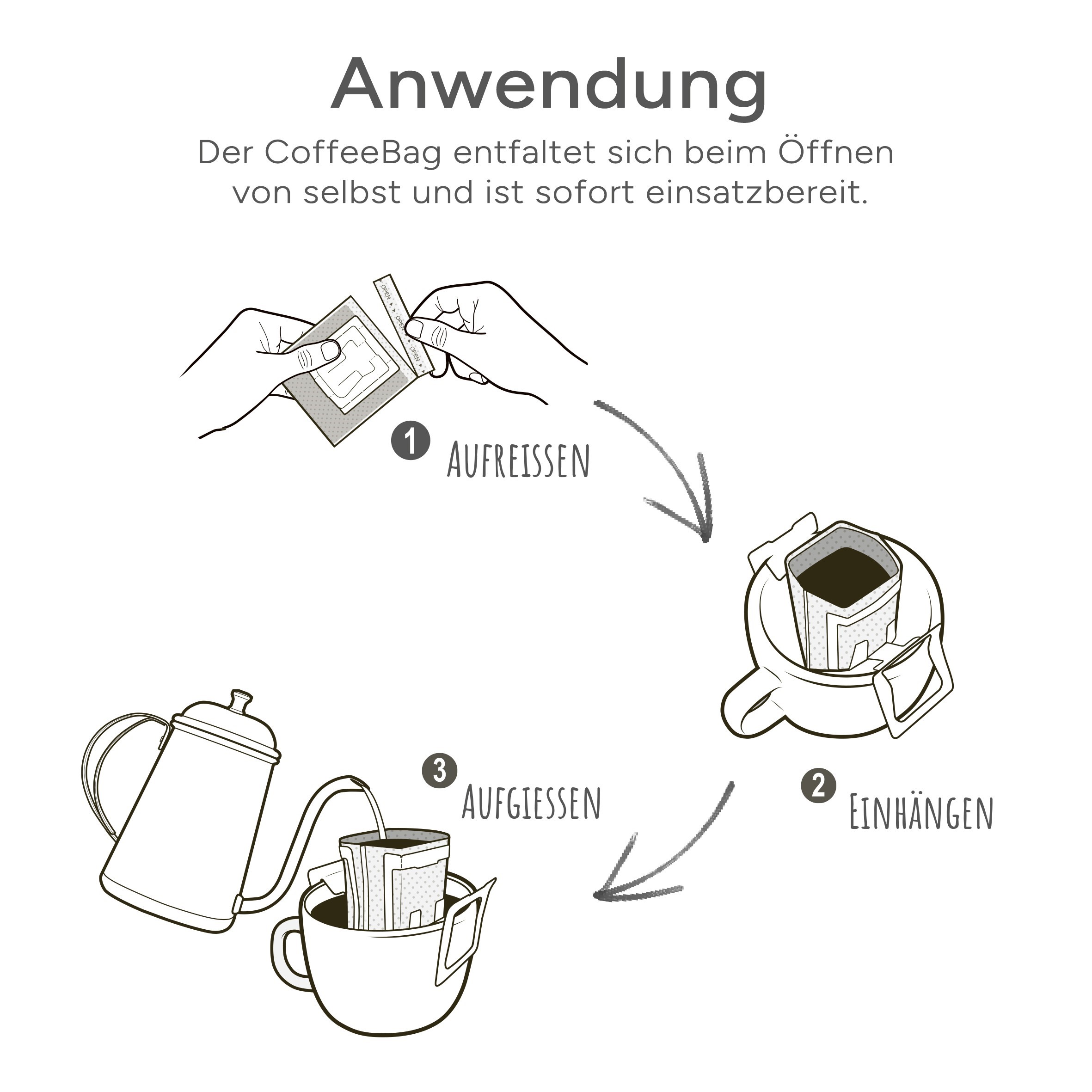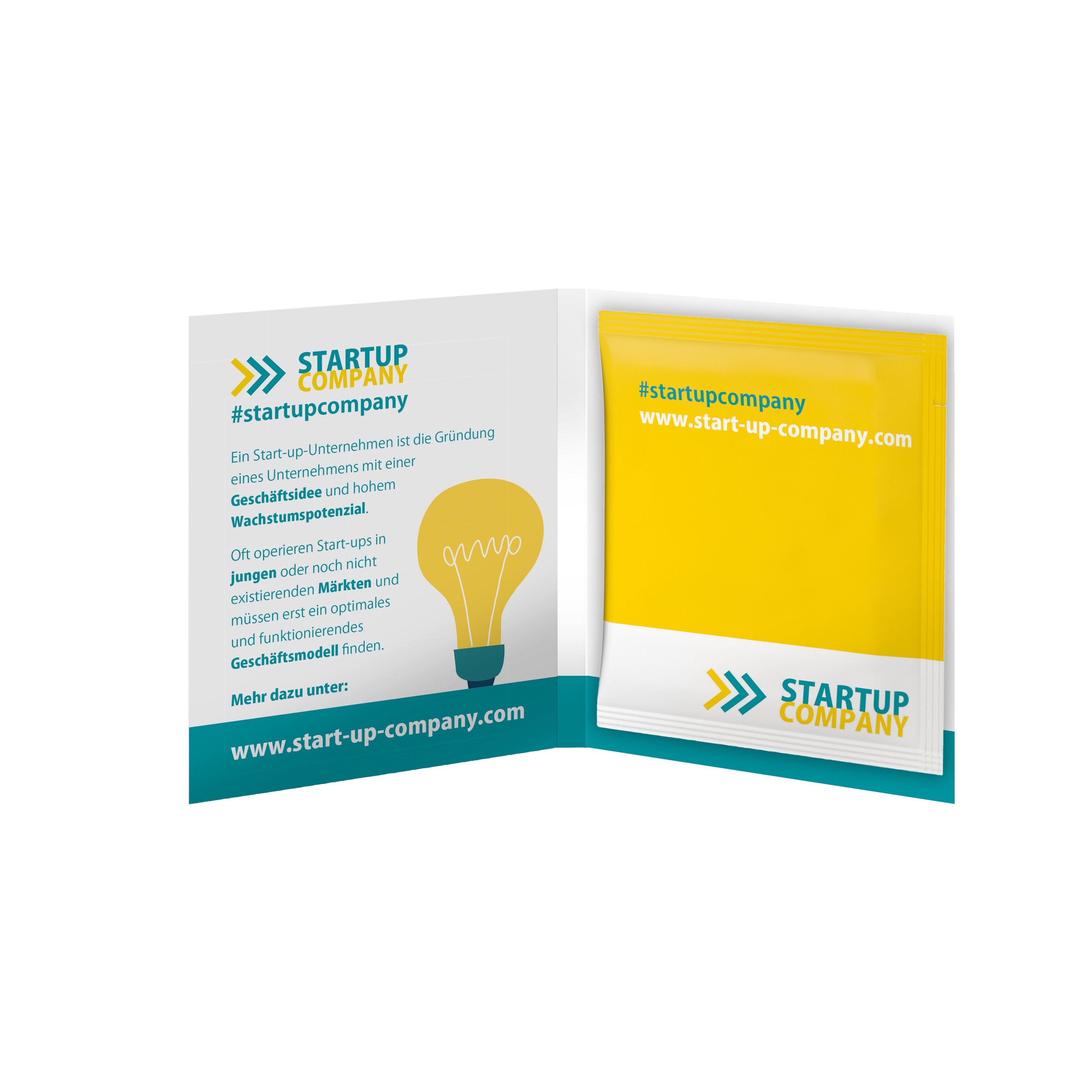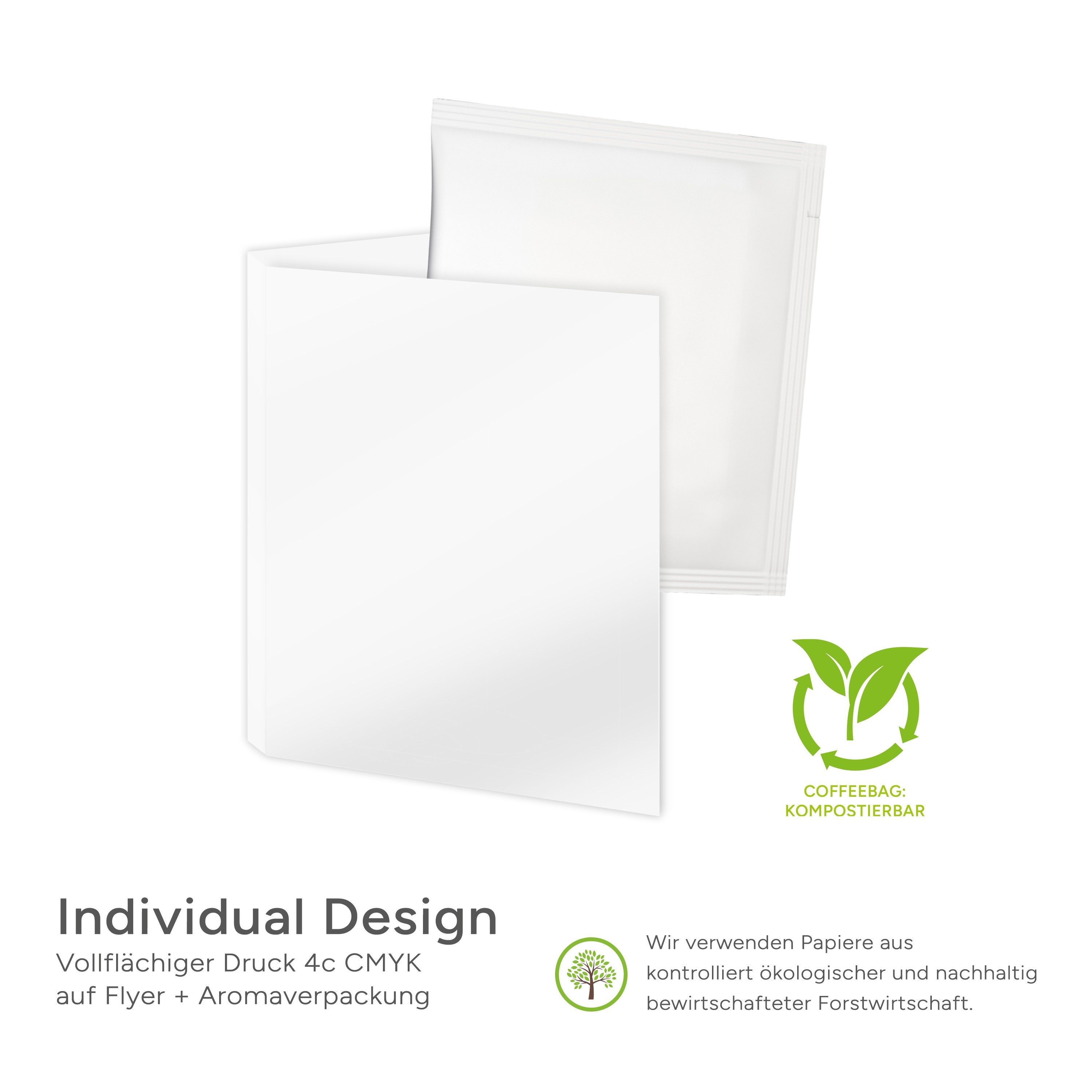 CoffeeFlyer (Klappkarte) mit eingeklebtem CoffeeBag. Seidenmatter Karton aus kontrolliert ökologischer und nachhaltig bewirtschafteter Forstwirtschaft. Enthält 1 CoffeeBag - die natürliche Alternative zu Kapseln. Kaffee-Filter mit 10 g gemahlenem Kaffee für 1 Tasse Filterkaffee, verpackt in bedruckter Aromaverpackung. Der CoffeeBag besteht aus nachwachsenden Rohstoffen und ist kompostierbar. So einfach gehts: Filter öffnen, auf die Tasse setzen, mit heißem Wasser übergießen - fertig. Kaffeesorte: Good Trade • Arabica-Kaffee aus verantwortungsvollem Handel mit transparenter Lieferkette • Schonende Trommelröstung in Deutschland • Regional abgefüllt in einem sozialtherapeutischem Betrieb • Würziges Aroma bei vollem und ausgewogenem Geschmack Dieser Kaffee überzeugt sowohl geschmacklich als auch ethisch. Der Rohkaffee kommt über nur 1 Zwischenhändler direkt von sorgfältig ausgewählten Bauern nach Deutschland. Das garantiert eine transparente Lieferkette und höchste Qualitäts- und Sozialstandards vom Anbau bis zur Röstung. Der Kaffee wird in Deutschland schonend geröstet und regional in einem sozialtherapeutischen Betrieb frisch abgefüllt – das garantiert ein volles Aroma und hohe soziale Verantwortung. Druck: 4-farbiger Digitaldruck (CMYK) auf die Aromaverpackung und die Klappkarte.