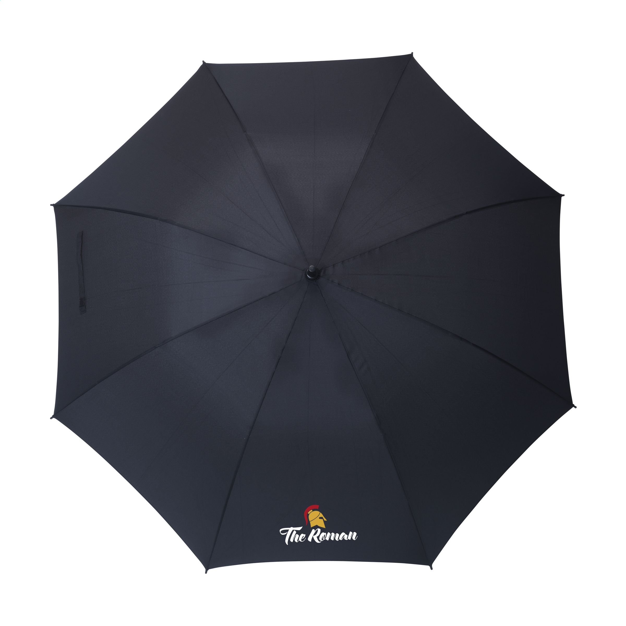 Regenschirm mit 190T Pongee Bespannung und einem extra großen Schirmdurchmesser von 132 cm. Mit automatischer Teleskopöffnung, Fiberglasrahmen und -schaft, Griff aus Weichschaum und Klettverschluss. Wasserabweisend.