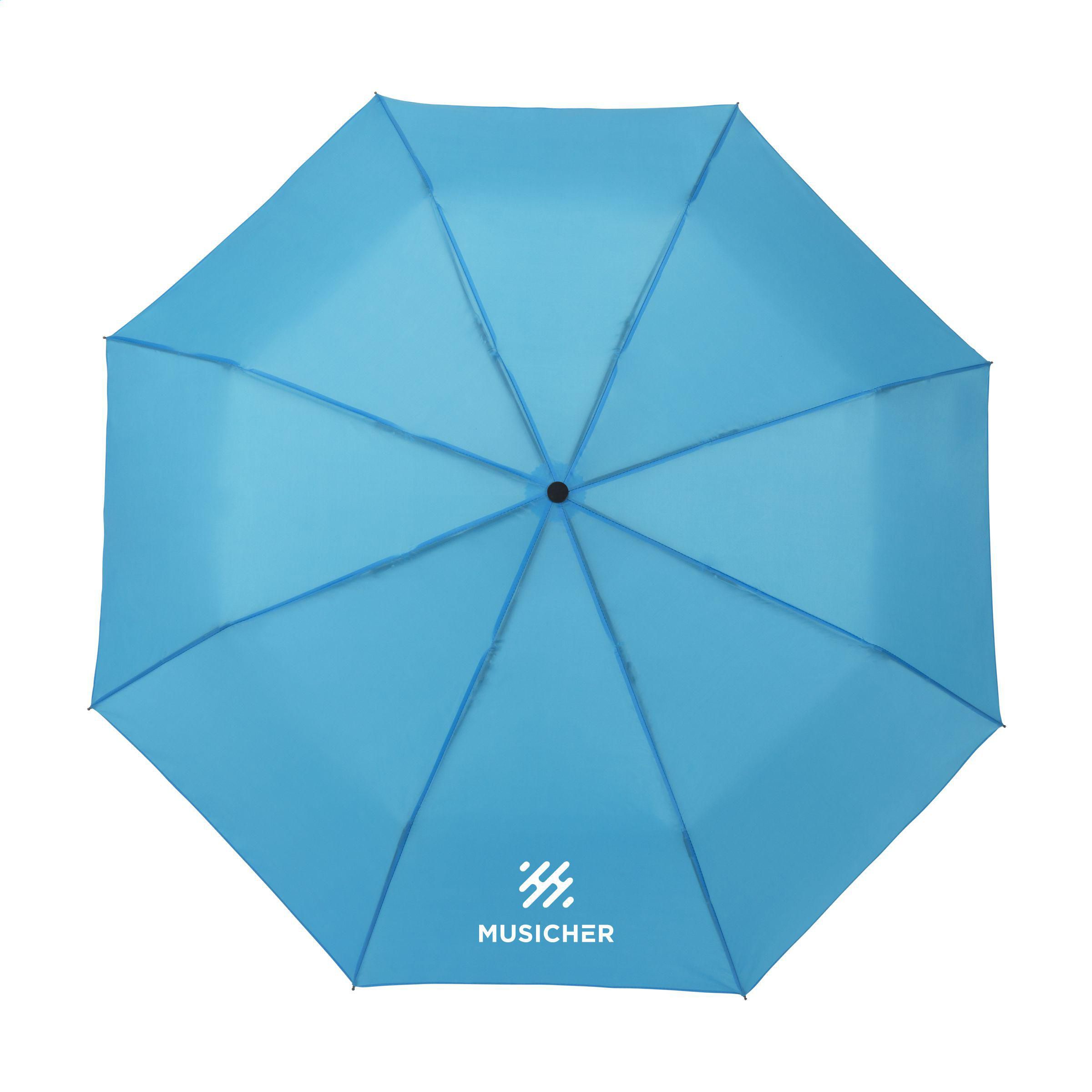 Kompakter, faltbarer Regenschirm mit 190T-Polyesterbezug. Metallrahmen und -griff, Kunststoff-Hängegriff mit Schlaufe, Klettverschluss und Aufbewahrungshülle. Manuelle Bedienung. Maße zusammengeklappt: Ø 5,5 x 24 cm.