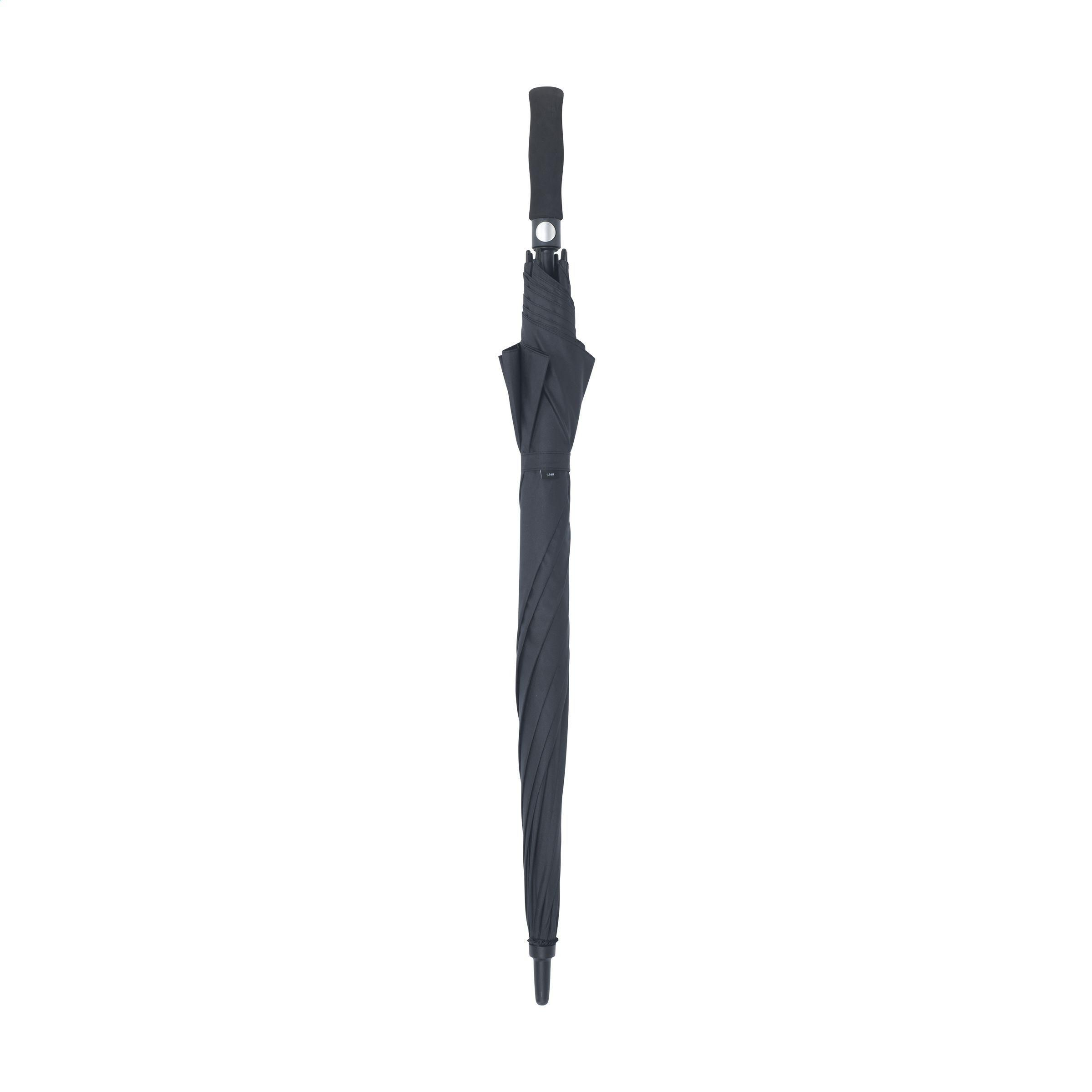 Regenschirm aus 190T RPET-Pongee (hergestellt aus recycelten PET-Flaschen) mit einem extra großen Schirmdurchmesser von 132 cm. Mit automatischer Teleskopöffnung, Fiberglasrahmen und -schaft, Griff aus Weichschaum und Klettverschluss. Wasserabweisend. RCS-zertifiziert. Recyceltes Material insgesamt: 18%.