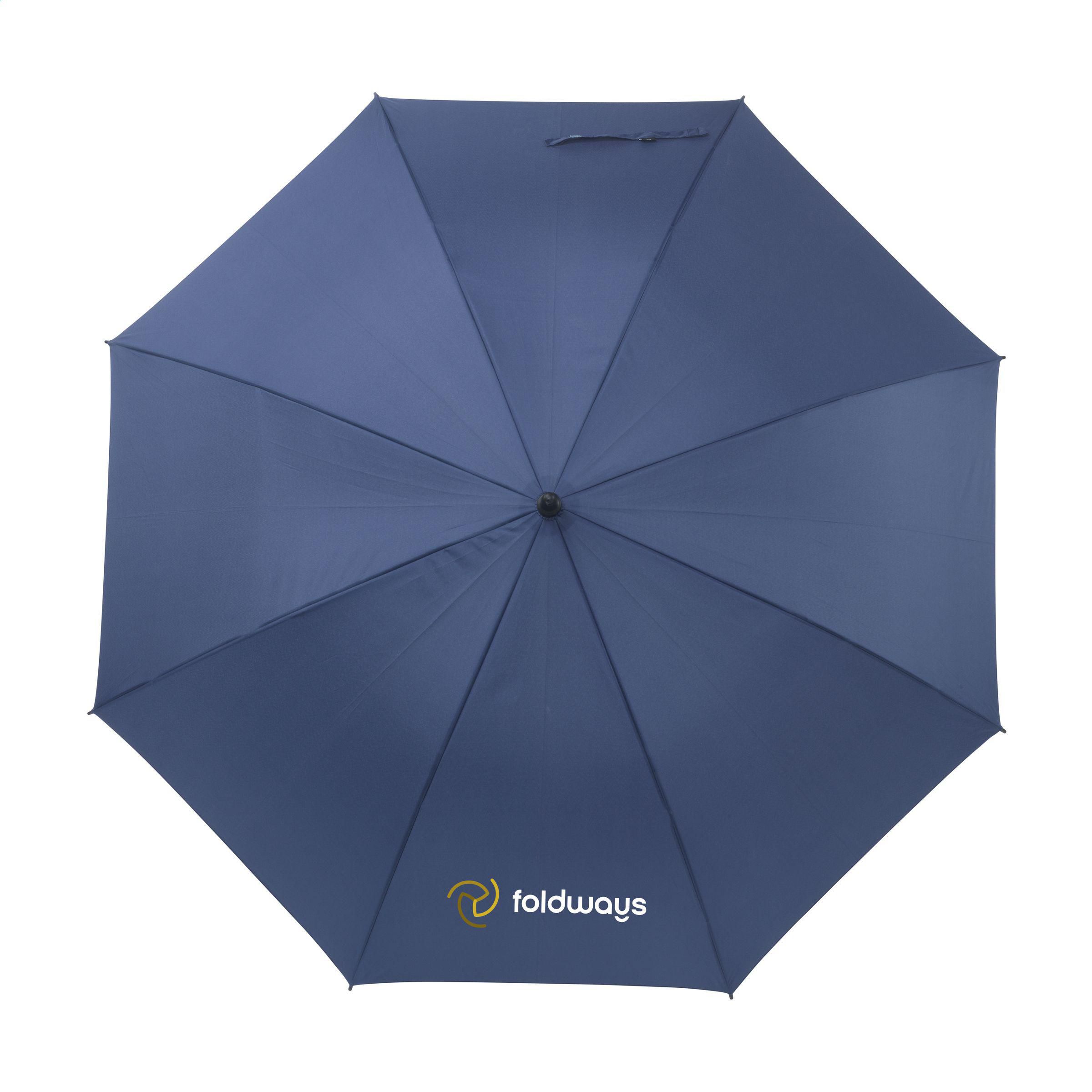 Regenschirm aus 190T RPET-Pongee (hergestellt aus recycelten PET-Flaschen) mit einem extra großen Schirmdurchmesser von 132 cm. Mit automatischer Teleskopöffnung, Fiberglasrahmen und -schaft, Griff aus Weichschaum und Klettverschluss. Wasserabweisend. RCS-zertifiziert. Recyceltes Material insgesamt: 18%.