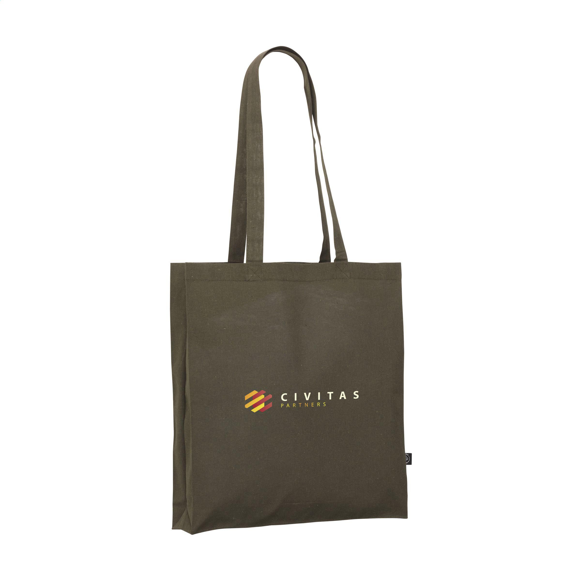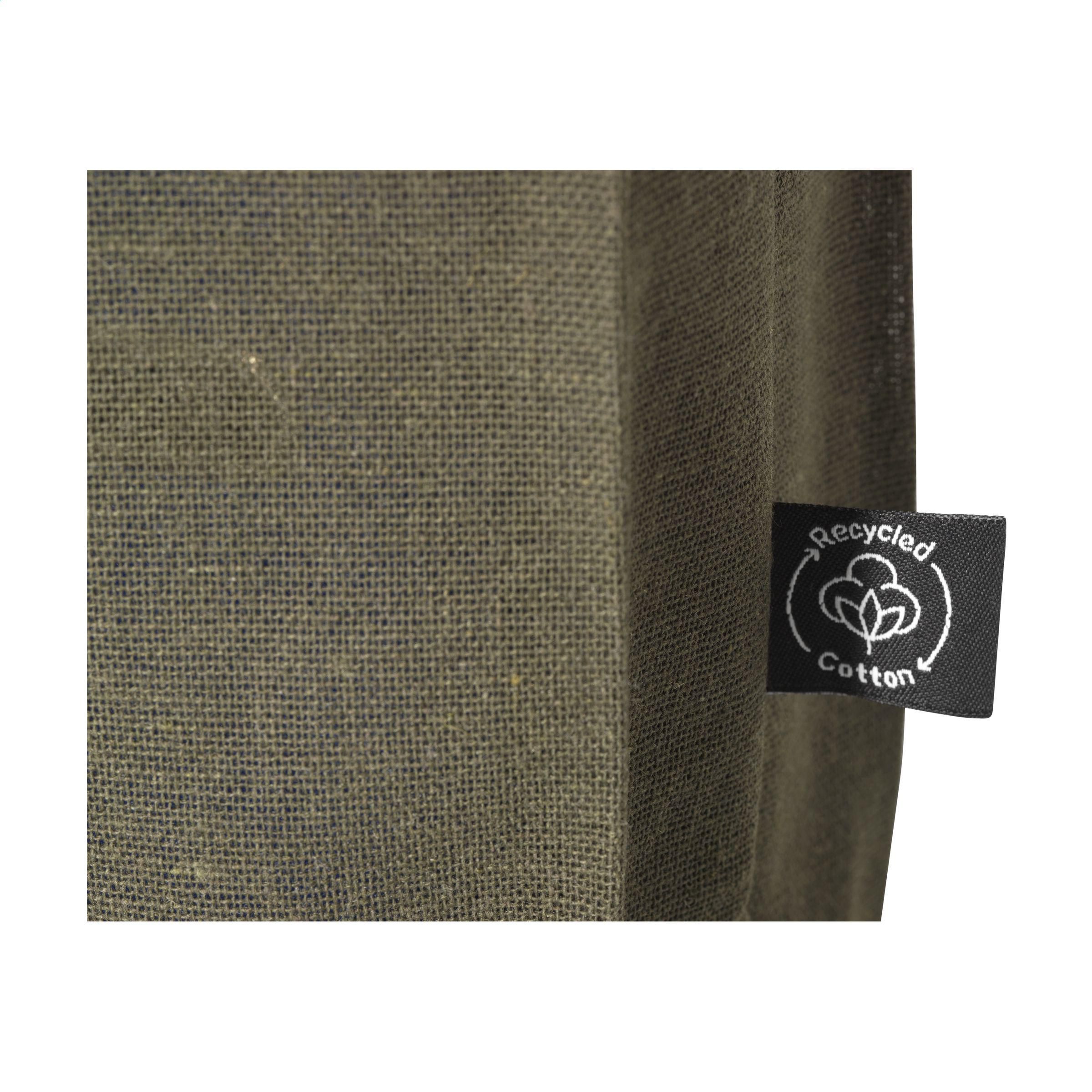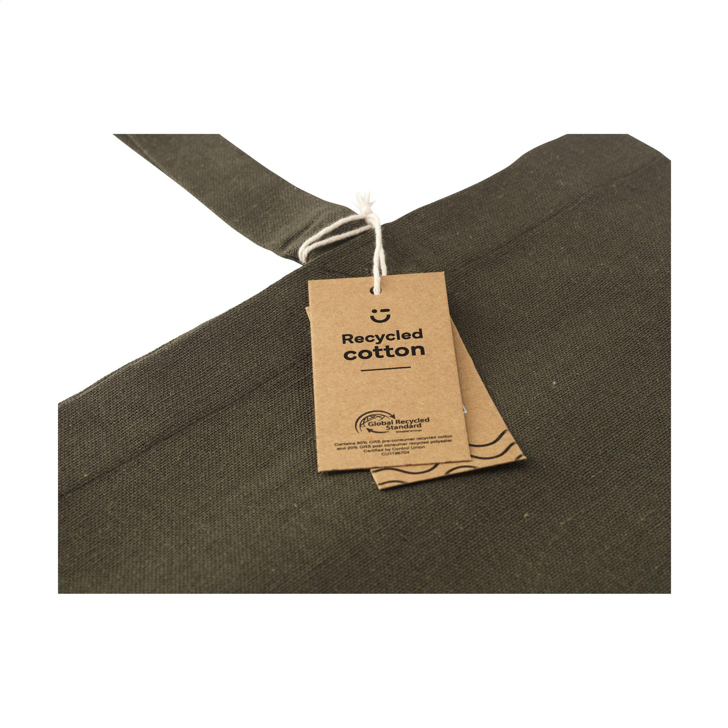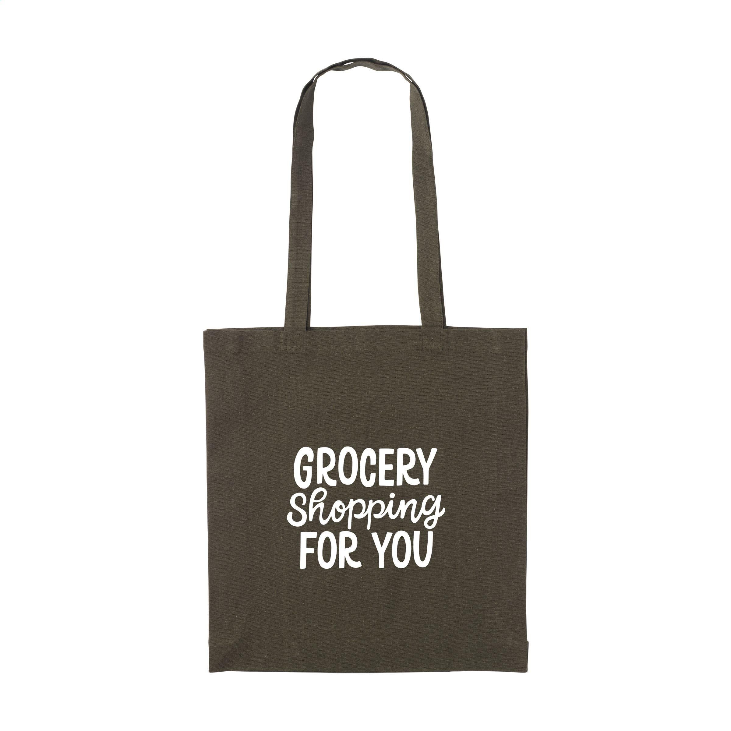 Robuste Einkaufstasche mit langen Griffen, aus 80% recyceltem Baumwoll-Segeltuch und 20% recyceltem Polyester (150 g/m²). GRS-zertifiziert. Recyceltes Material insgesamt: 100%. Fassungsvermögen ca. 12 Liter.