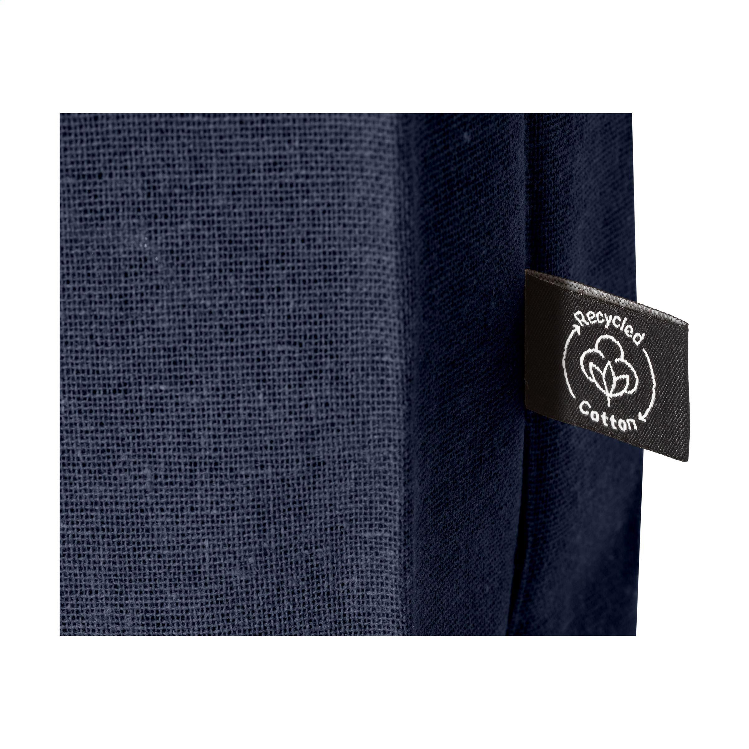 Robuste Einkaufstasche mit langen Griffen, aus 80% recyceltem Baumwoll-Segeltuch und 20% recyceltem Polyester (150 g/m²). GRS-zertifiziert. Recyceltes Material insgesamt: 100%. Fassungsvermögen ca. 12 Liter.