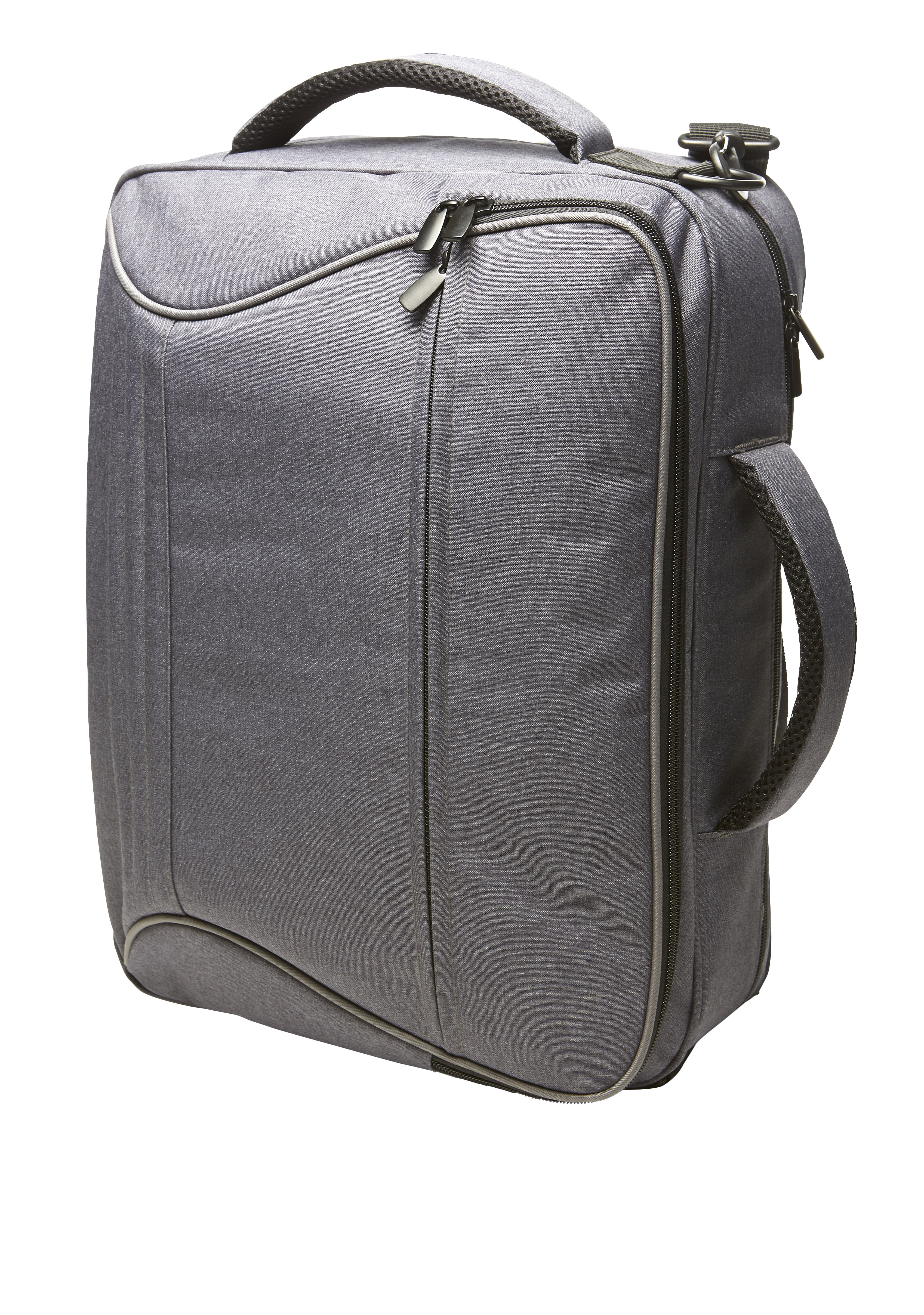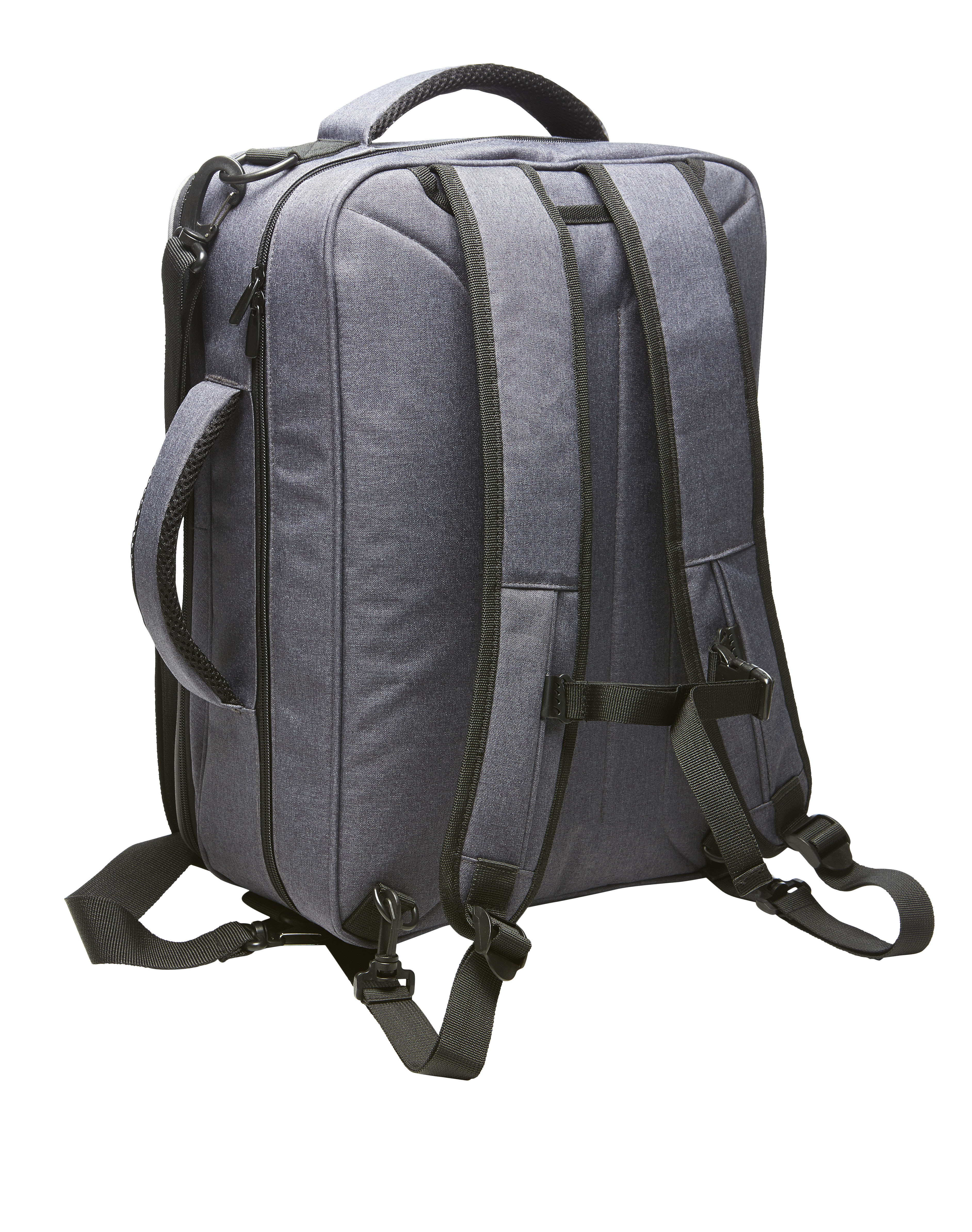Komfortable Businesstasche / Rucksack mit raffinierten Details; großes, gepolstertes Hauptfach mit Notebook-Halterung; Bodenfüße; Reißverschlussvortasche mit Organizer-Elementen; flache Reißverschluss-Vortasche; 2 gepolsterte Handgriffe; abnehmbarer und längenverstellbarer Schultergurt; gepolsterte und versenkbare Rucksackträger; höhenverstellbarer Brustgurt
