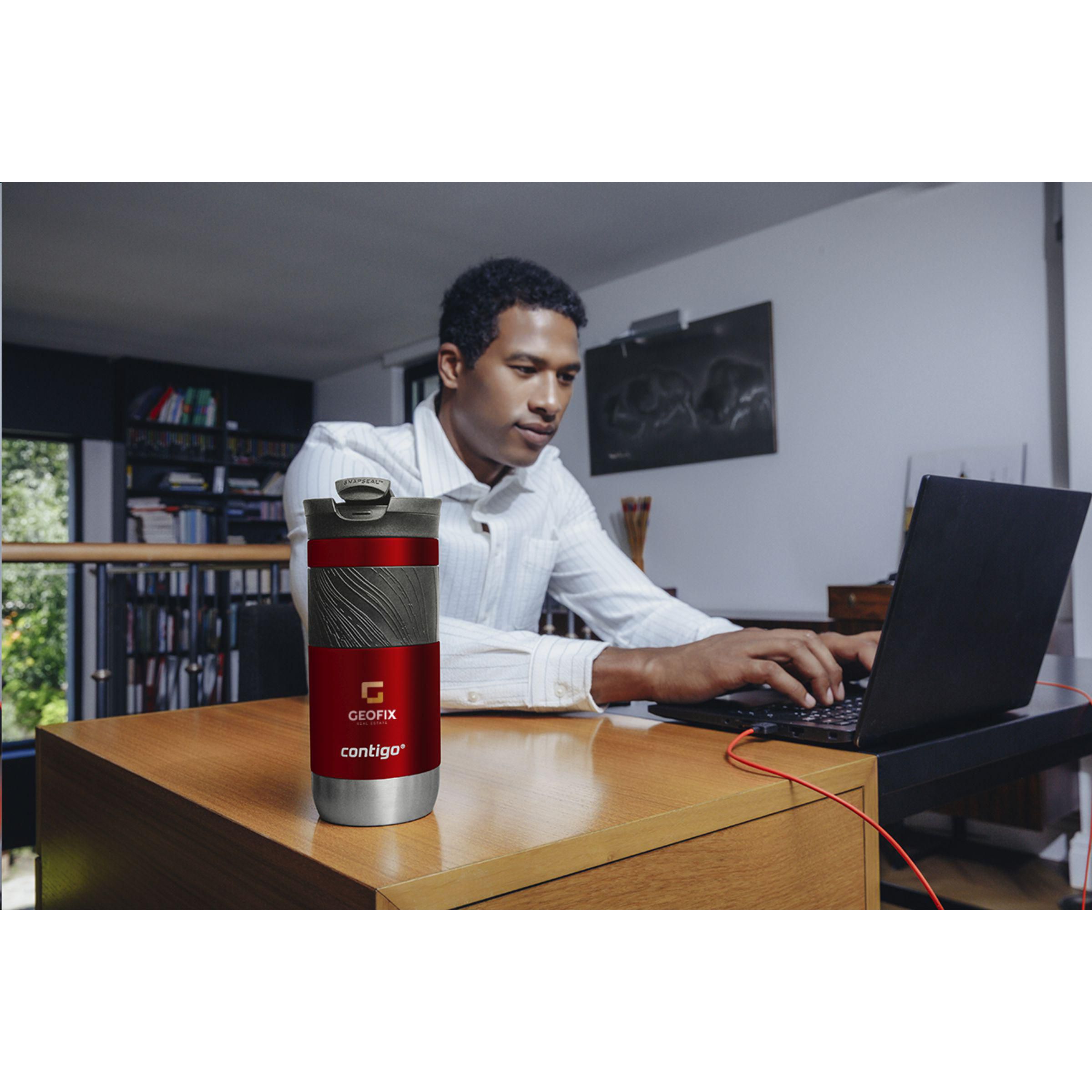 Doppelwandige rostfreie Edelstahl-Thermobecher: vakuumisoliert, versehen mit einem großzügigen, gummierten Antirutsch-Griff, Trinköffnung mit SNAPSEAL™-Technologie, macht das Trinken angenehm. Zum Trinken den Knopf mit einer Hand hochdrücken und zum Schließen des Bechers nach unten drücken. 100% auslaufsicher. Die THERMALOCK™-Technologie hält Getränke bis zu 18 Stunden kalt oder bis zu 7 Stunden warm. Nur der Deckel ist spühmaschinengeeignet (in der oberen Korb stellen). Spülen Sie den Becher mit der Hand. Fassungsvermögen 470 ml. LAGERBESTANDSINFORMATION: Bis zu 1.000 Stück innerhalb von 10 Arbeitstagen verfügbar. Ausnahmen vorbehalten. Contigo: der Spezialist bei Qualität, Design und Technologie. Direkt erkennbar an dem schlichten und zeitlosen Design - haltbar und robust. Die innovativen Contigo Wasserflaschen und Thermobecher sind geruchs- und geschmacksneutral und BPA-frei. Die Trinkflaschen sind mit einer Hand zu bedienen und garantiert tropfsicher, so ist die überall und jederzeit nutzbar. Mit 2 Jahre Herstellergarantie.