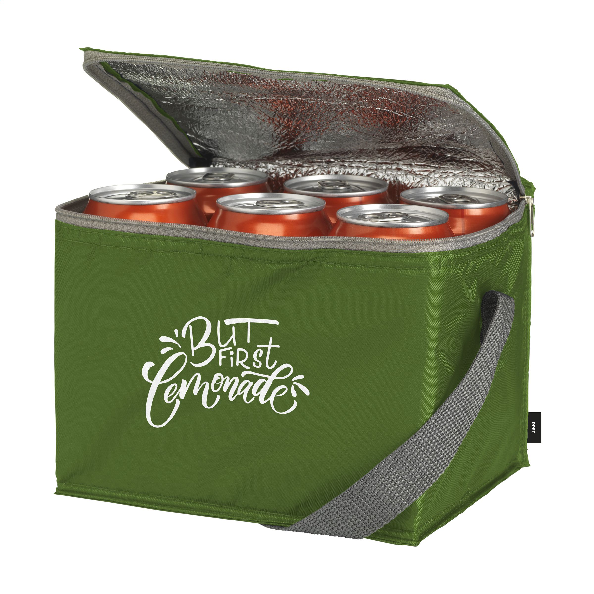 WoW! Kühltasche aus 210D-RPET-Polyester: hergestellt aus recycelten PET-Flaschen. Geeignet für 6 Getränkedosen. Mit Trageriemen. GRS-zertifiziert. Fassungsvermögen ca. 3,5 Liter.