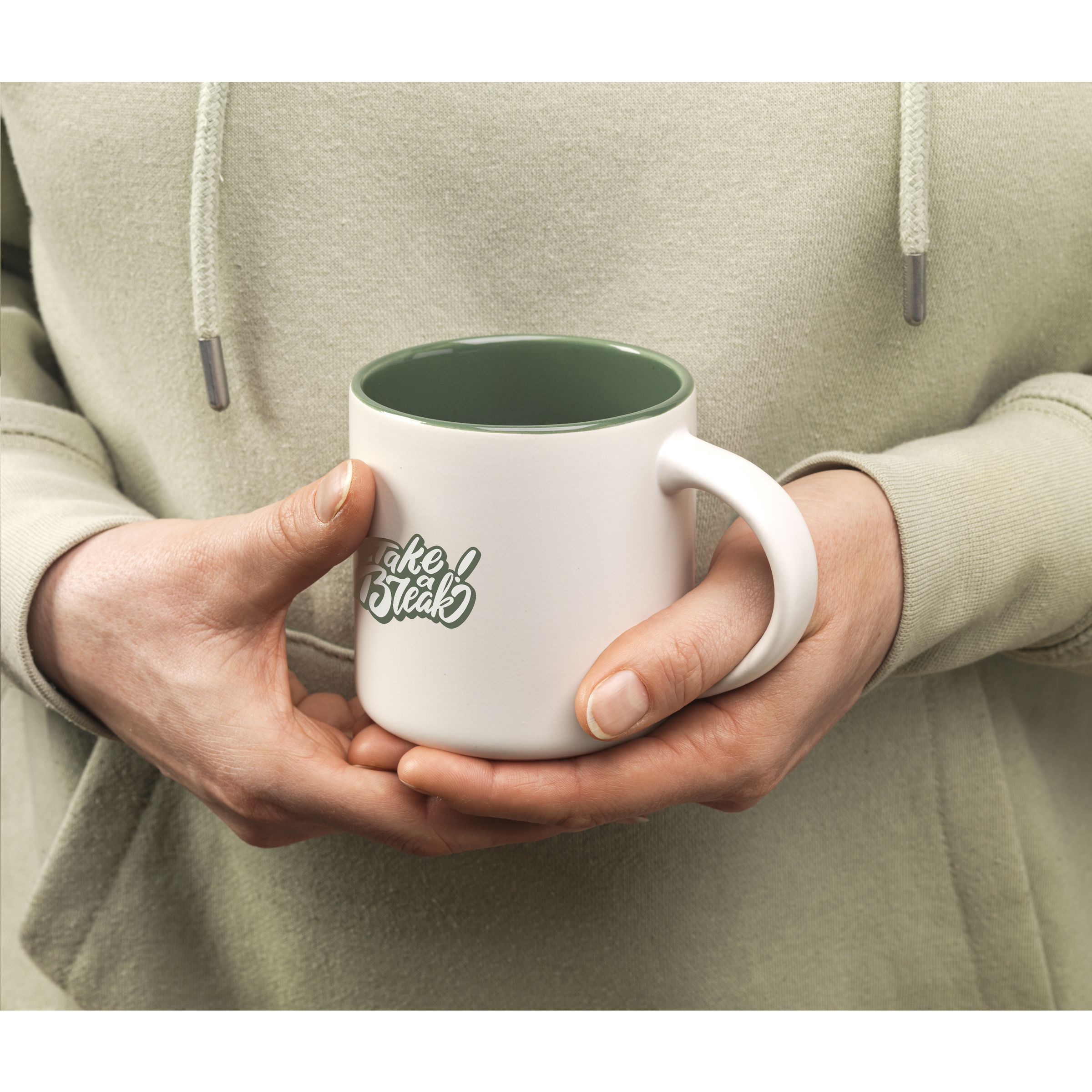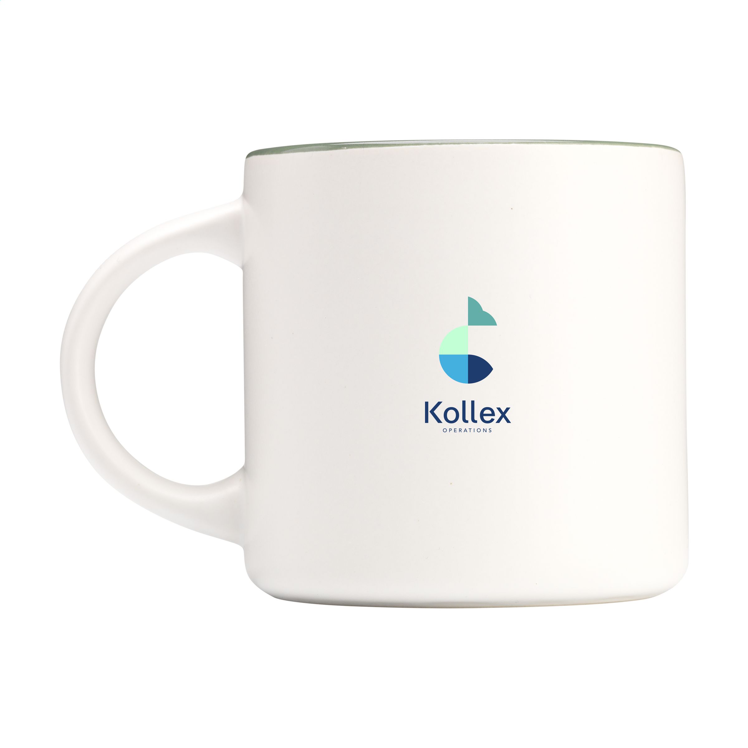 Tasse aus hochwertiger Keramik. Mit matter Außenseite und einer farbigen Hochglanz-Innenseite. Spühlmachinenfest. Fassungsvermögen 330 ml.