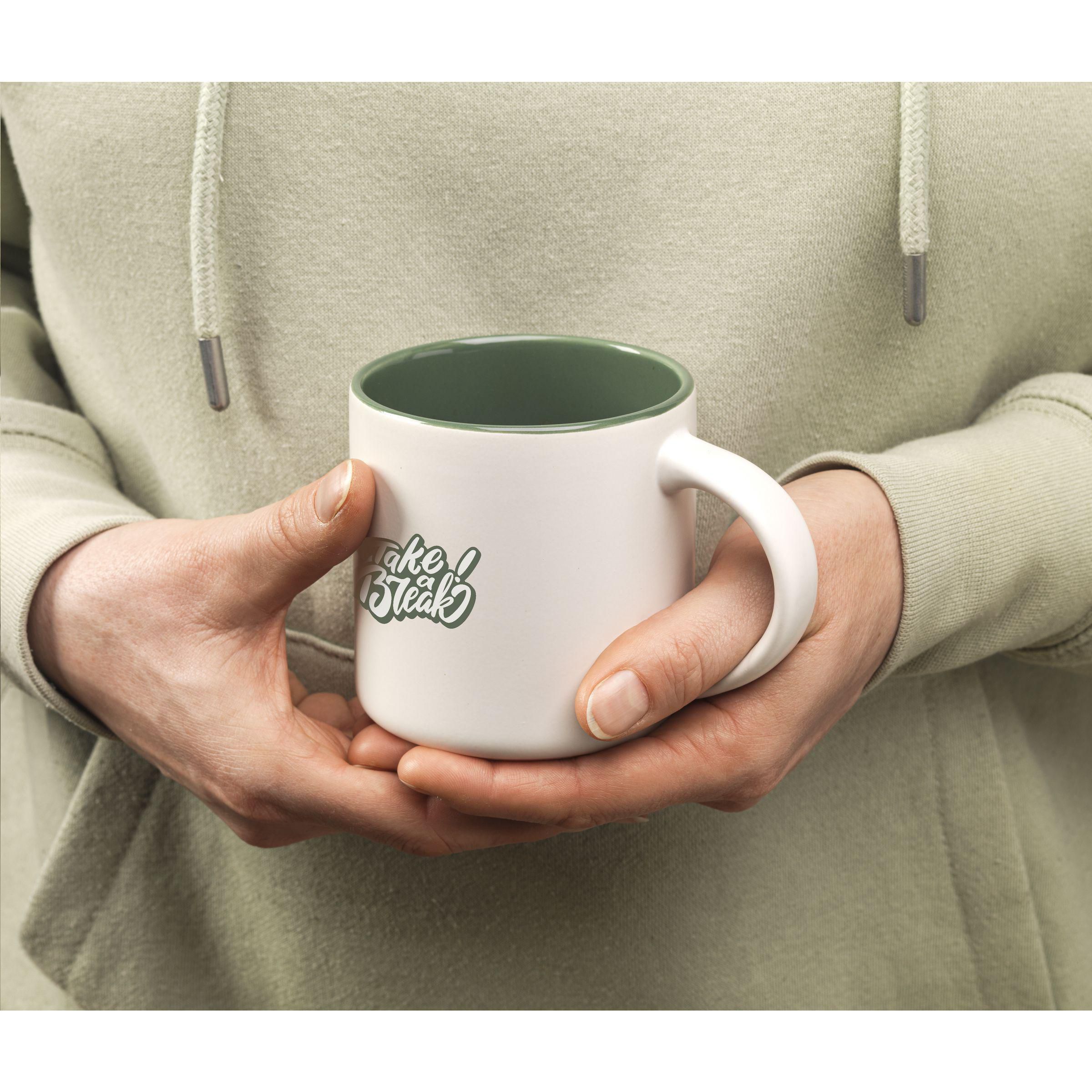 Becher aus hochwertiger Keramik. Mit matter Außenseite und einer farbigen Hochglanz-Innenseite. Spühlmachinenfest. Fassungsvermögen 330 ml.
