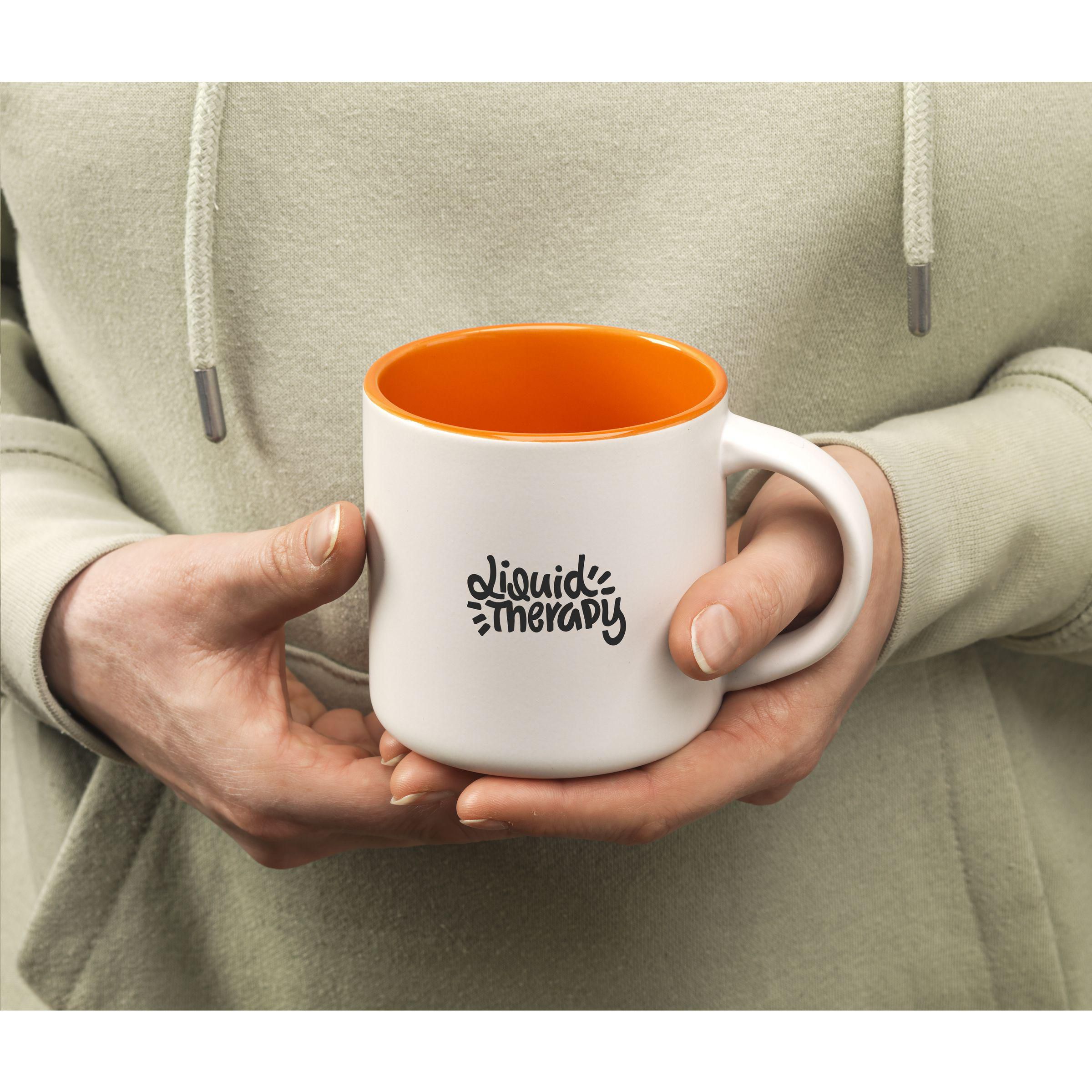 Becher aus hochwertiger Keramik. Mit matter Außenseite und einer farbigen Hochglanz-Innenseite. Spühlmachinenfest. Fassungsvermögen 330 ml.