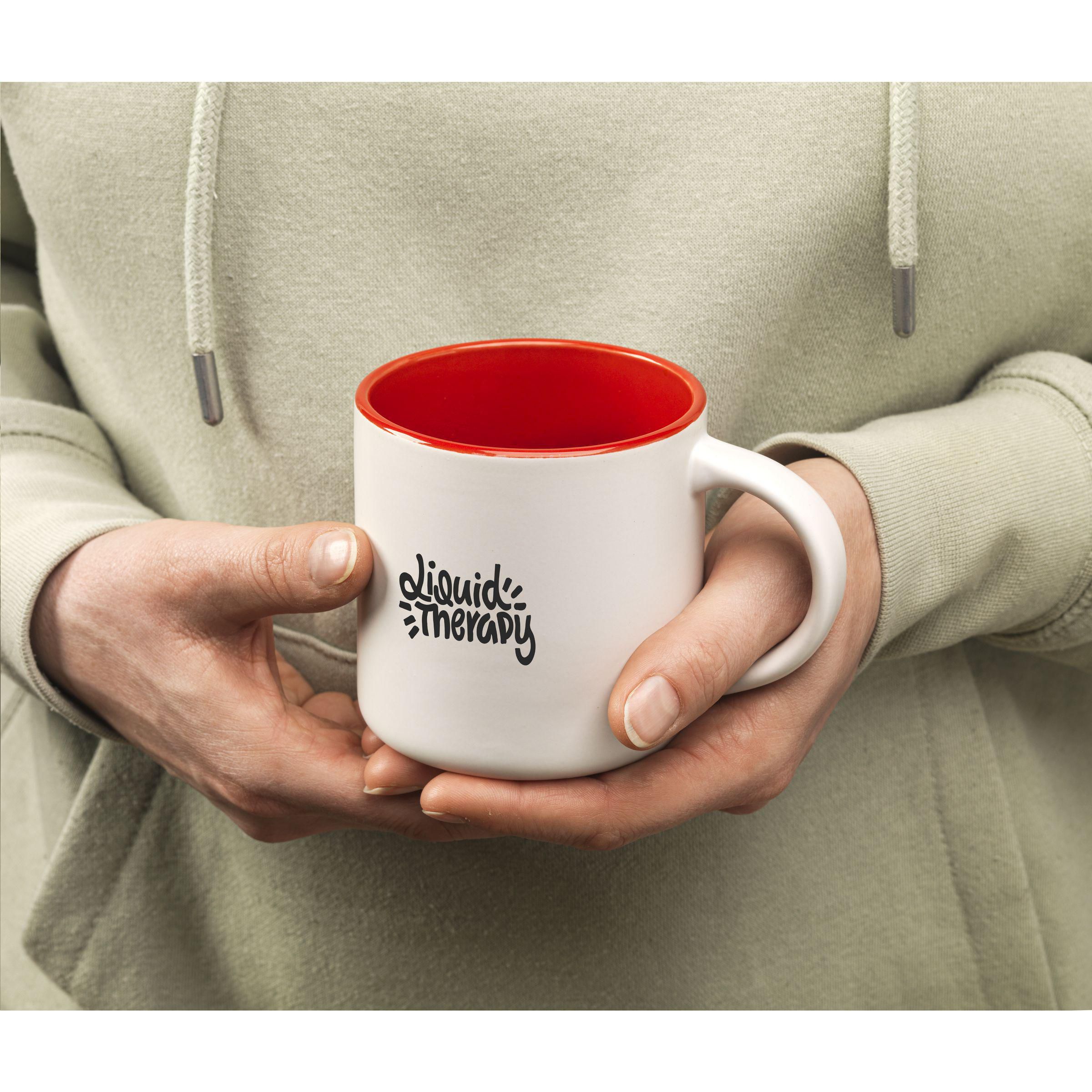 Becher aus hochwertiger Keramik. Mit matter Außenseite und einer farbigen Hochglanz-Innenseite. Spühlmachinenfest. Fassungsvermögen 330 ml.