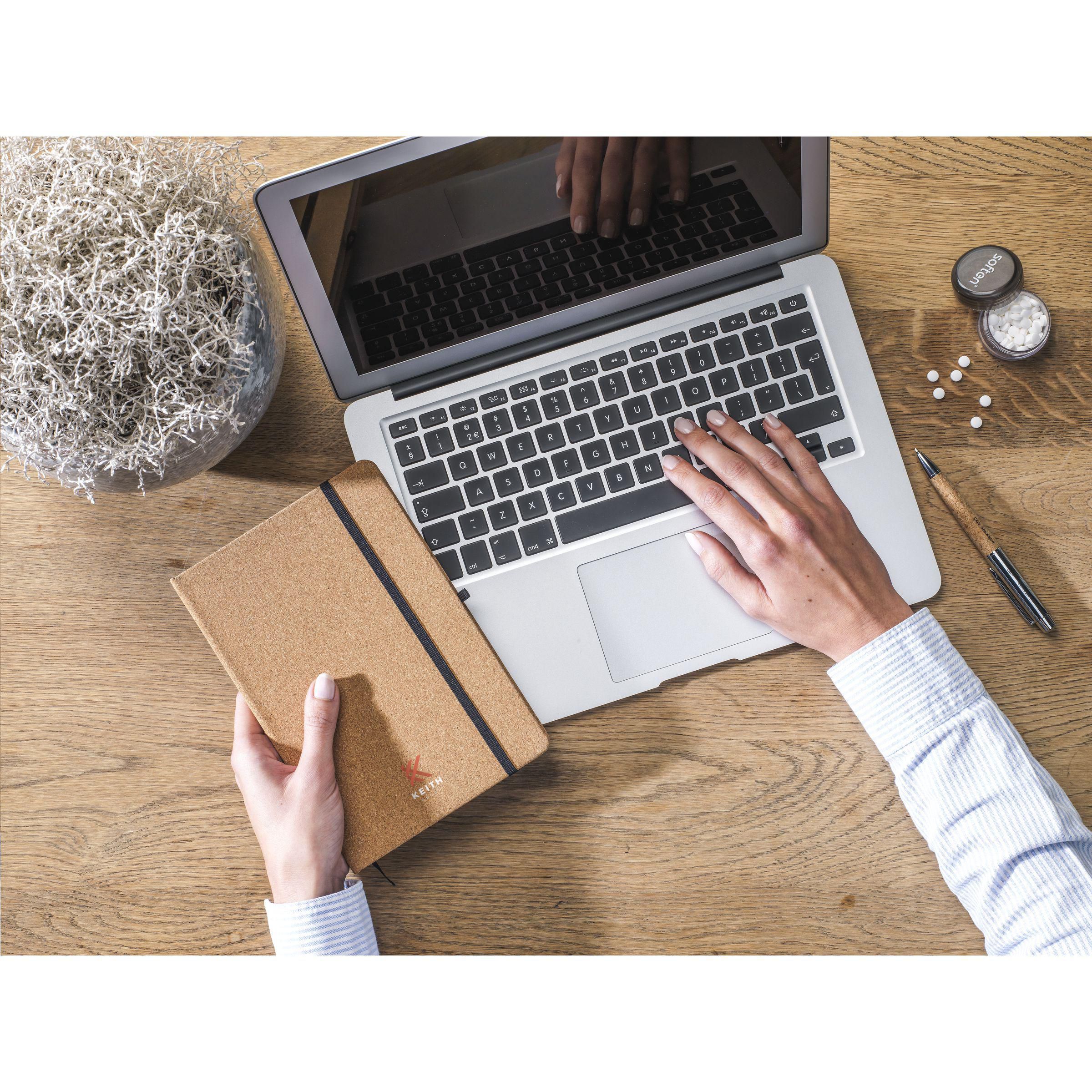 Notizbuch im A5-Format aus Kork. Mit ca. 80 Blatt/160 Seiten cremefarbenem, liniertem, FSC Mix zertifiziertem Papier (70 g/m²). Mit praktischem Stiftfach, elastisch und gebunden.
