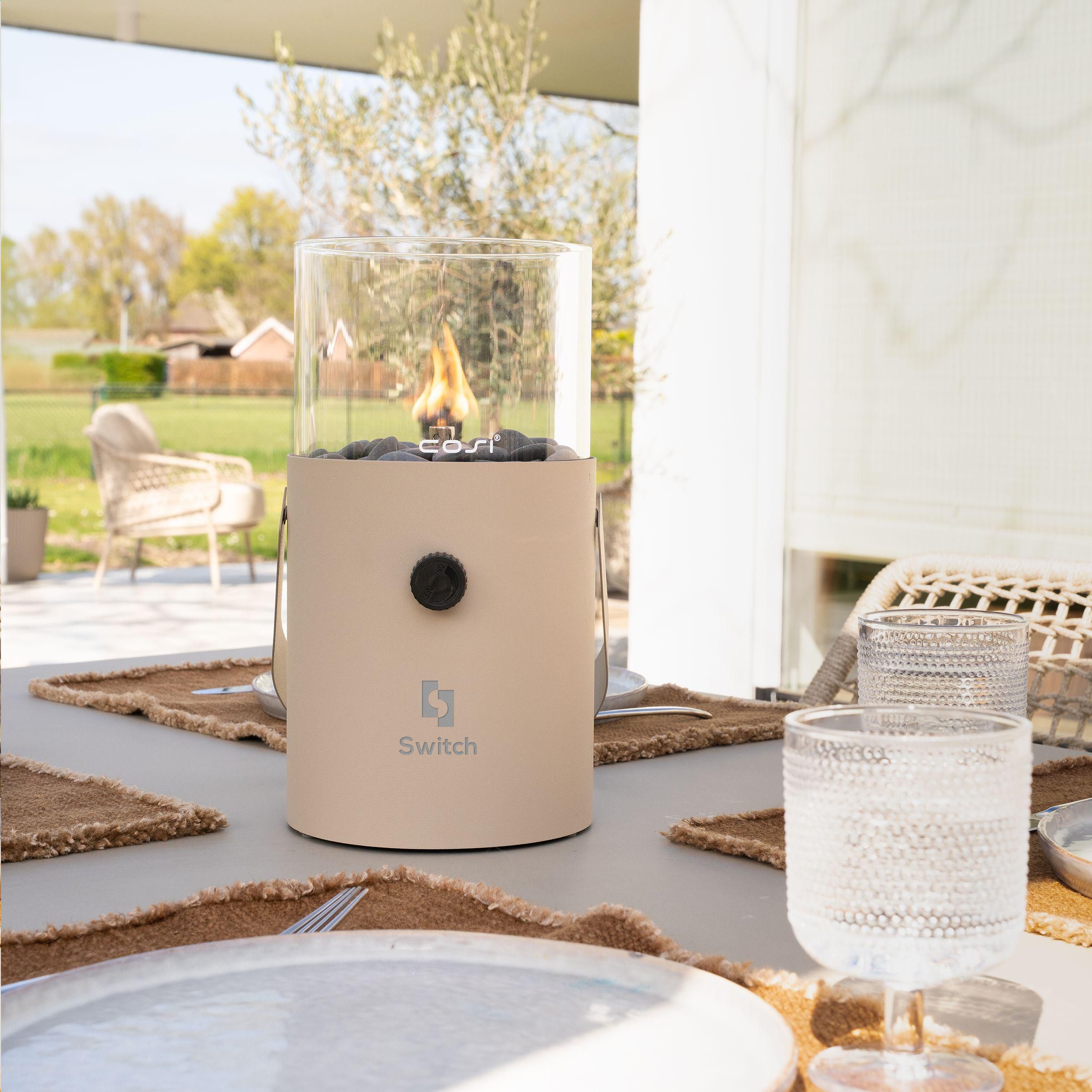 Gaslaterne der Marke Cosi. Diese Gaslaterne ist aus robustem Metall gefertigt und mit einer Pulverbeschichtung und einem transparenten Glas versehen. Ein einzigartiger Stimmungsmacher für den Garten und das Haus. Dieses luxuriöse Tischmodell kann dank des praktischen Tragegriffs überall aufgestellt werden. Die Laterne wird mit einer 190 Gramm schweren Propan/Butan-Gaskartusche betrieben (nicht im Lieferumfang enthalten). Brenndauer: 5 bis 6 Stunden mit einer Gaskartusche. Inklusive transparentem Glas und Kieselsteinen.