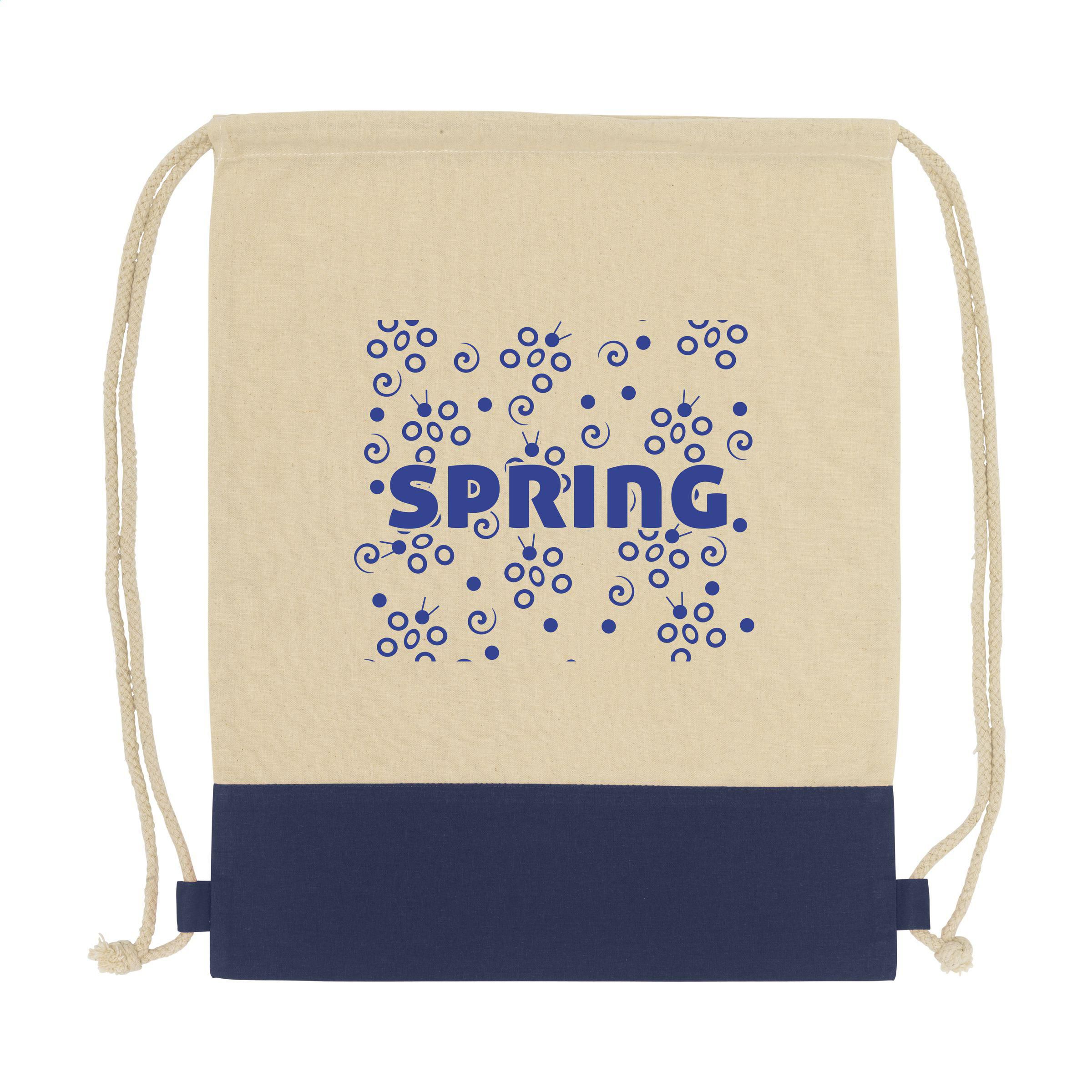 Rucksack mit Zugkordel aus 100% Baumwolle (125 g/m²) und farbigem Einsatz. Fassungsvermögen ca. 8 Liter.