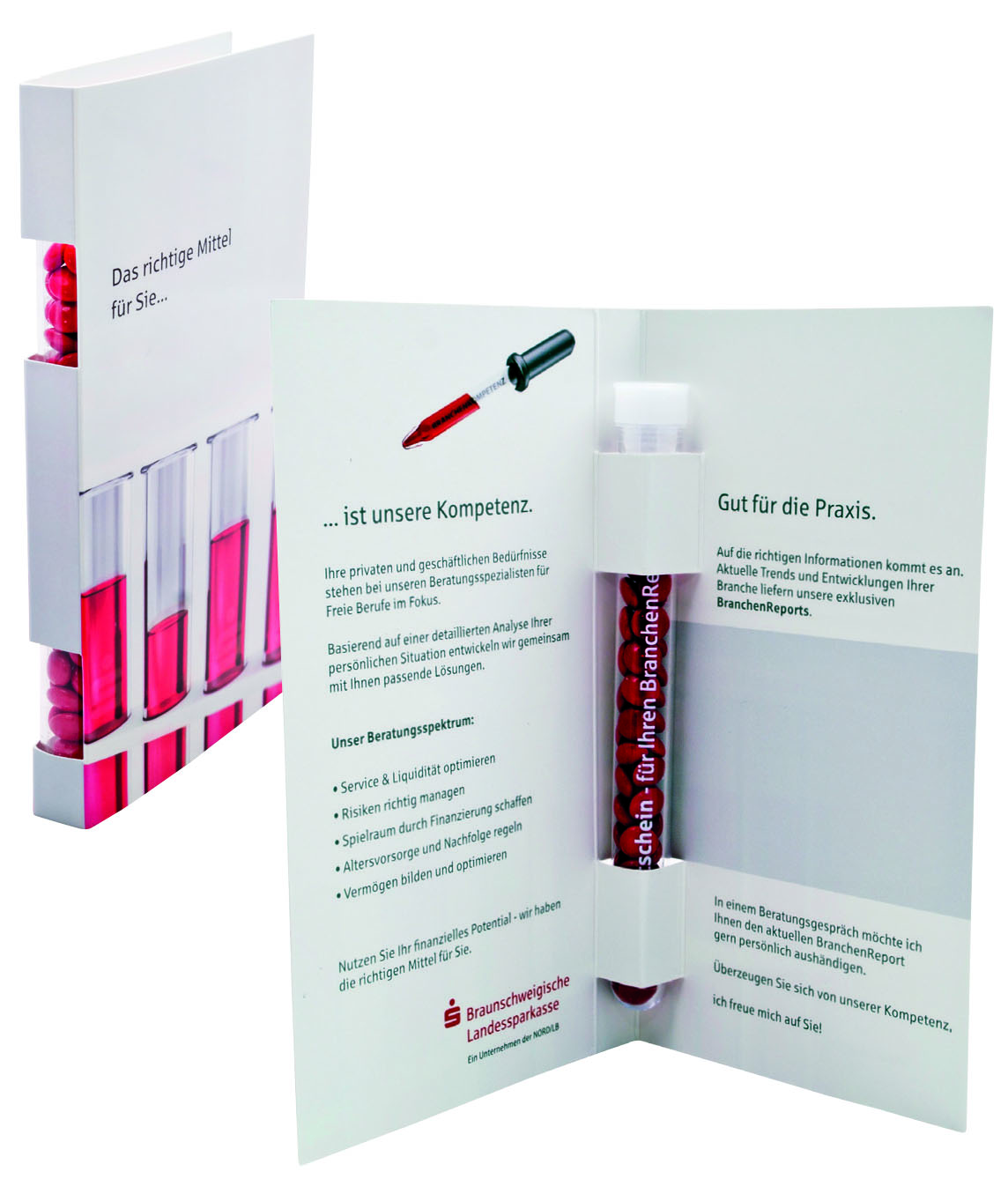 Karton-Umschlag mit einer Halterung für ein Reagenzglas, inkl. Konfektionierung, exkl. Reagenzglas. Inkl. individuellem 4c-Druck auf der Cover Card. Druckvorkosten bereits inklusive. Auch Sonderstanzungen der Karte möglich - sprechen Sie uns an.