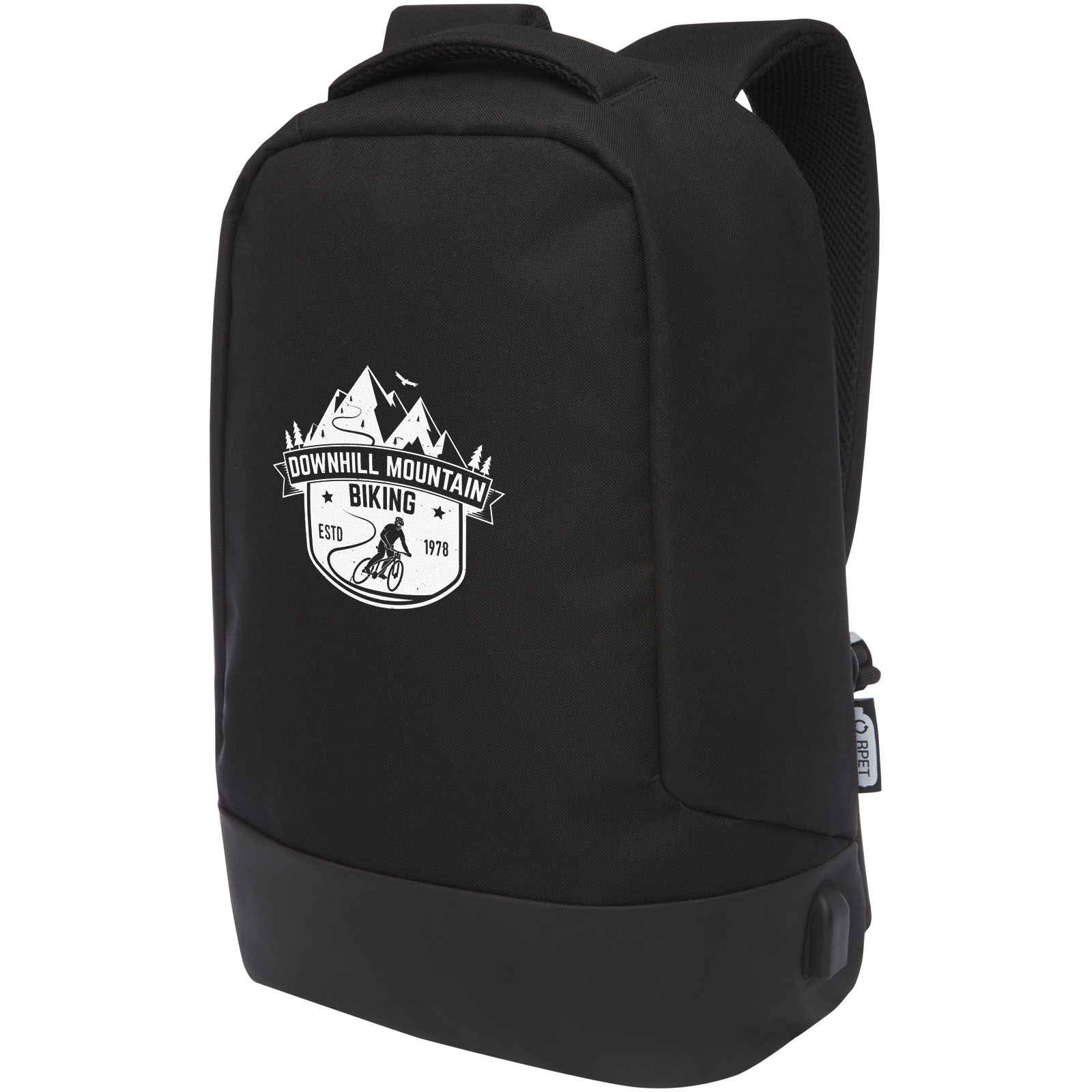 GRS zertifizierter Rucksack, ausgestattet mit einem offenen Hauptfach mit Ordnungsfach, gepolsterter 15" Laptophülle und 2 Taschen mit RFID-Schutz. USB-Port auf der rechten Seite zum einfachen Anschließen und Laden von Geräten aus dem Innenraum. Mit gepolsterten Schultergurten, rechtem Schultergurt, versteckter Reißverschlusstasche, Haltegriff und Trolley-Durchgriff. Für die Herstellung dieser Tasche werden ca. 15 Kunststoffflaschen recycelt.