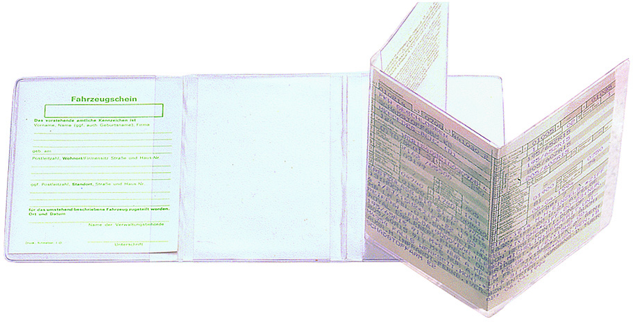 Aufklappbares Etui zum Schutz des Fahrzeugscheins aus wertiger Strukturklarsichtfolie. VPE 1000. -