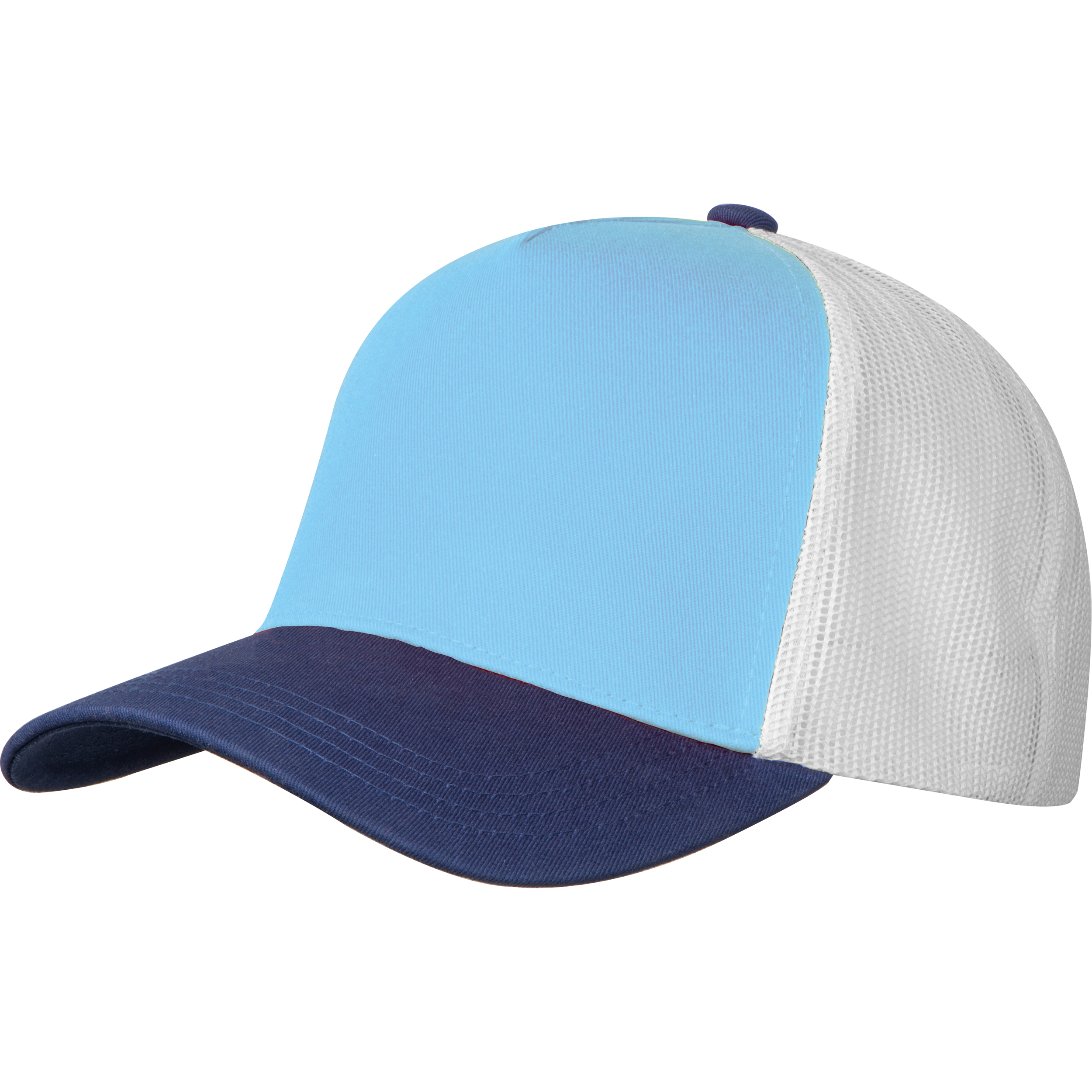 Hochwertige Cap aus Baumwolle (290 g / m²) und Mesheinsatz mit gebogenem Schirm und größenverstellbarer Druckknopflasche. Ihre Werbung drucken wir auf die Front.