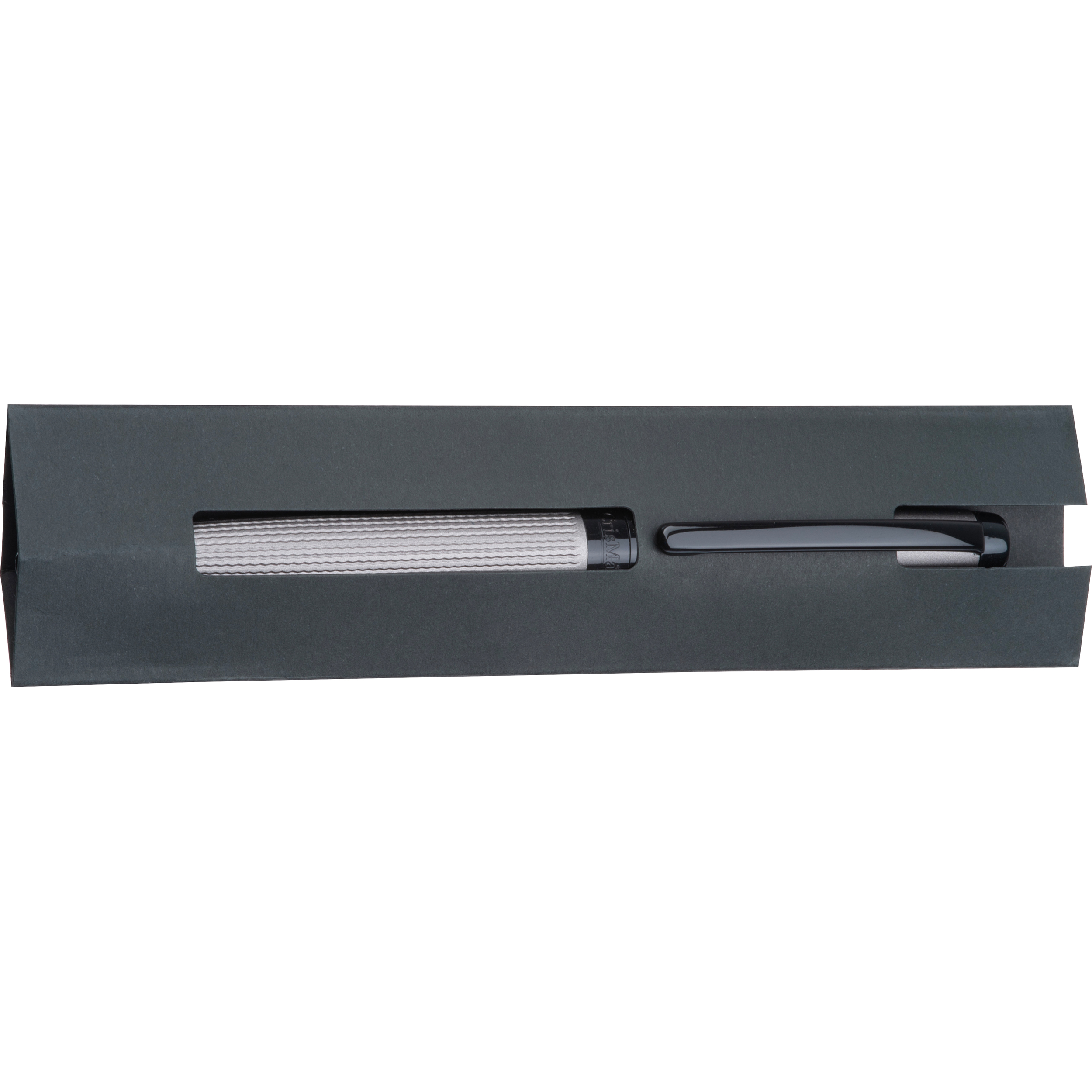 Grauer Edelstahl Drehkugelschreiber in mattem Design mit schwarzen Applikationen und blau schreibender Großraummine. Ihre Werbung wird rechts vom Clip graviert.
