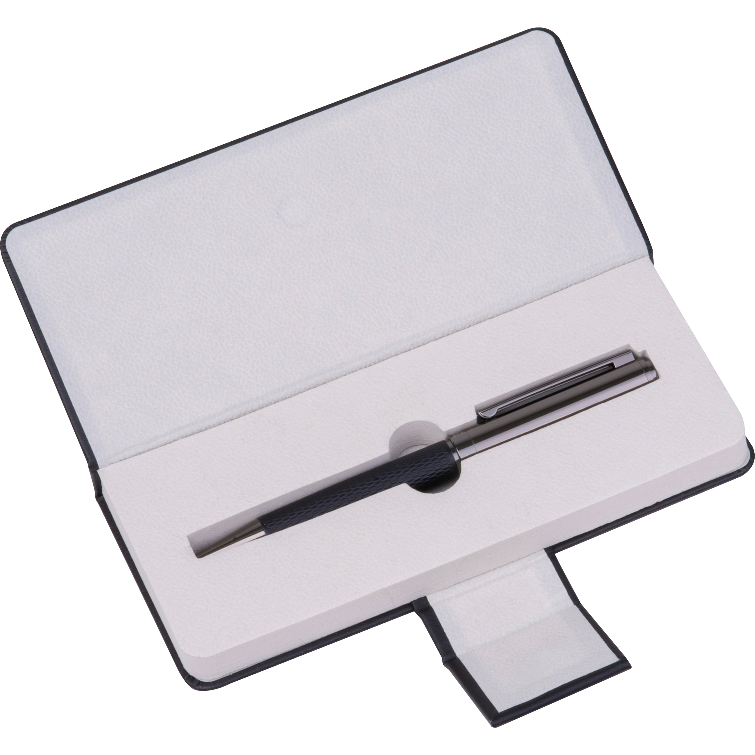 CrisMa Metallkugelschreiber mit gesmusteter Griffzone, blauschreibend, einer Schreiblänge von 1.200m und verpackt in einer Box mit Magnetschließe. Ihr Logo gravieren wir neben den Clip.